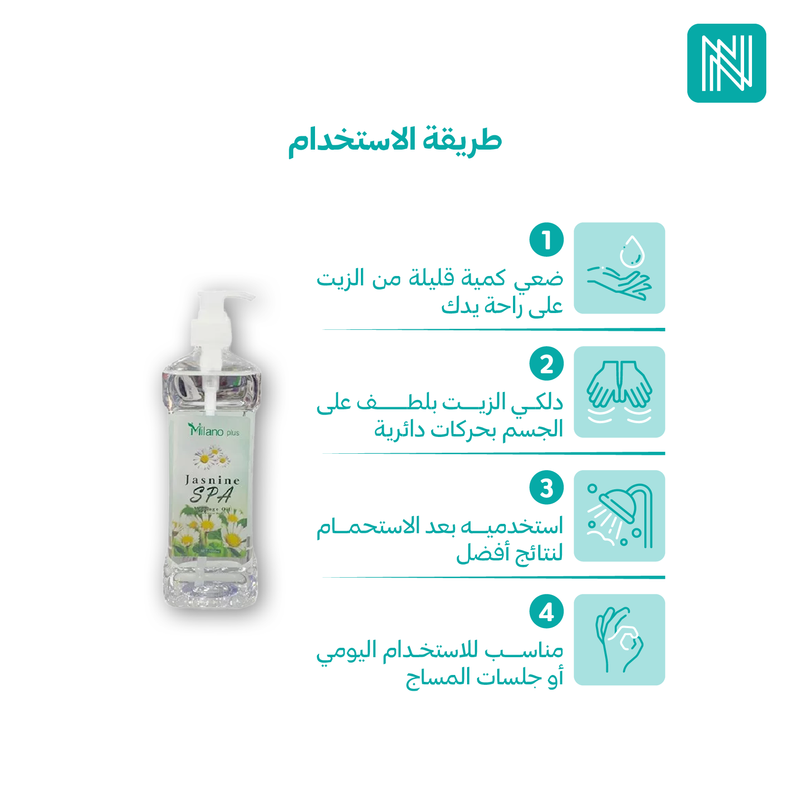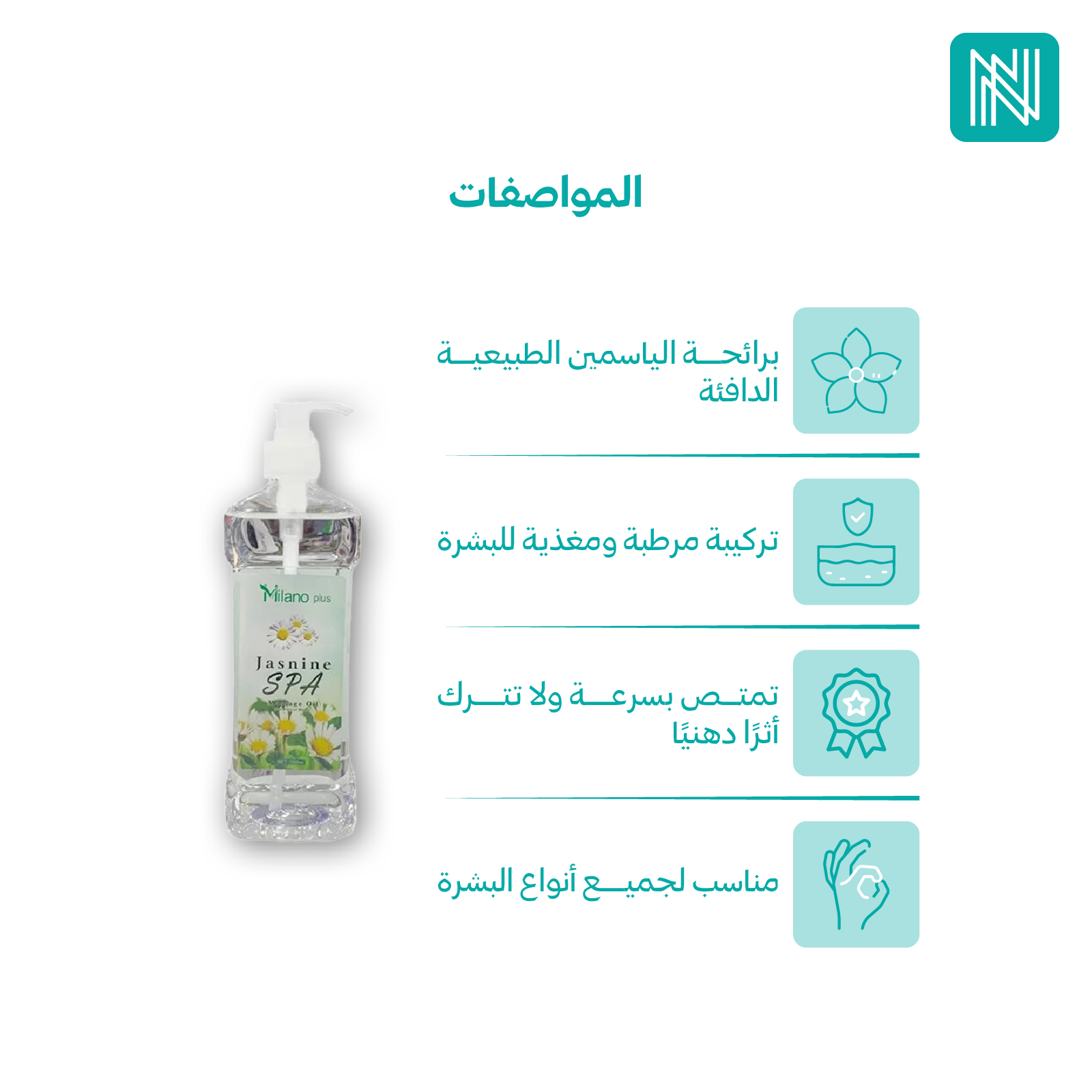 دللي حواسك مع زيت المساج ميلانو بلس بنكهة الياسمين، المصمم خصيصًا لتجربة تدليك فاخرة تجمع بين الترطيب والراحة.