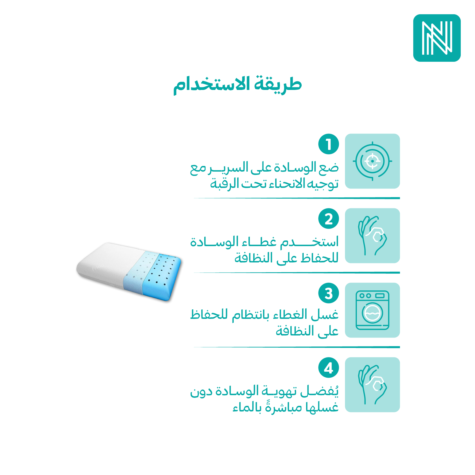 3- يمكن غسل الغطاء بانتظام، بينما يُفضل تهوية الوسادة وعدم غسلها بالماء مباشرة.