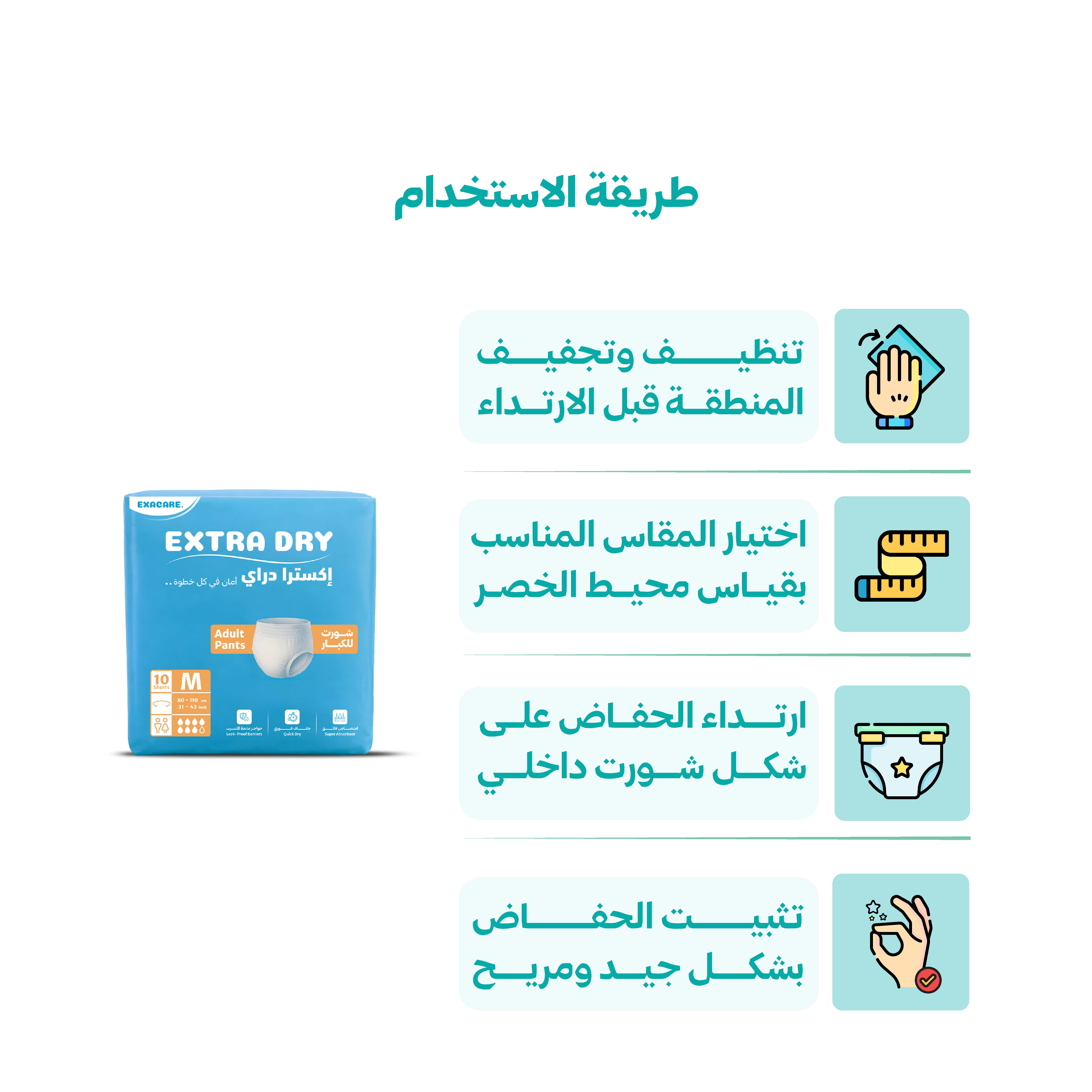 2- تأكد من اختيار المقاس المناسب لحفاض الشورت، وذلك بقياس محيط الخصر ومقارنته بجدول المقاسات المتاح.