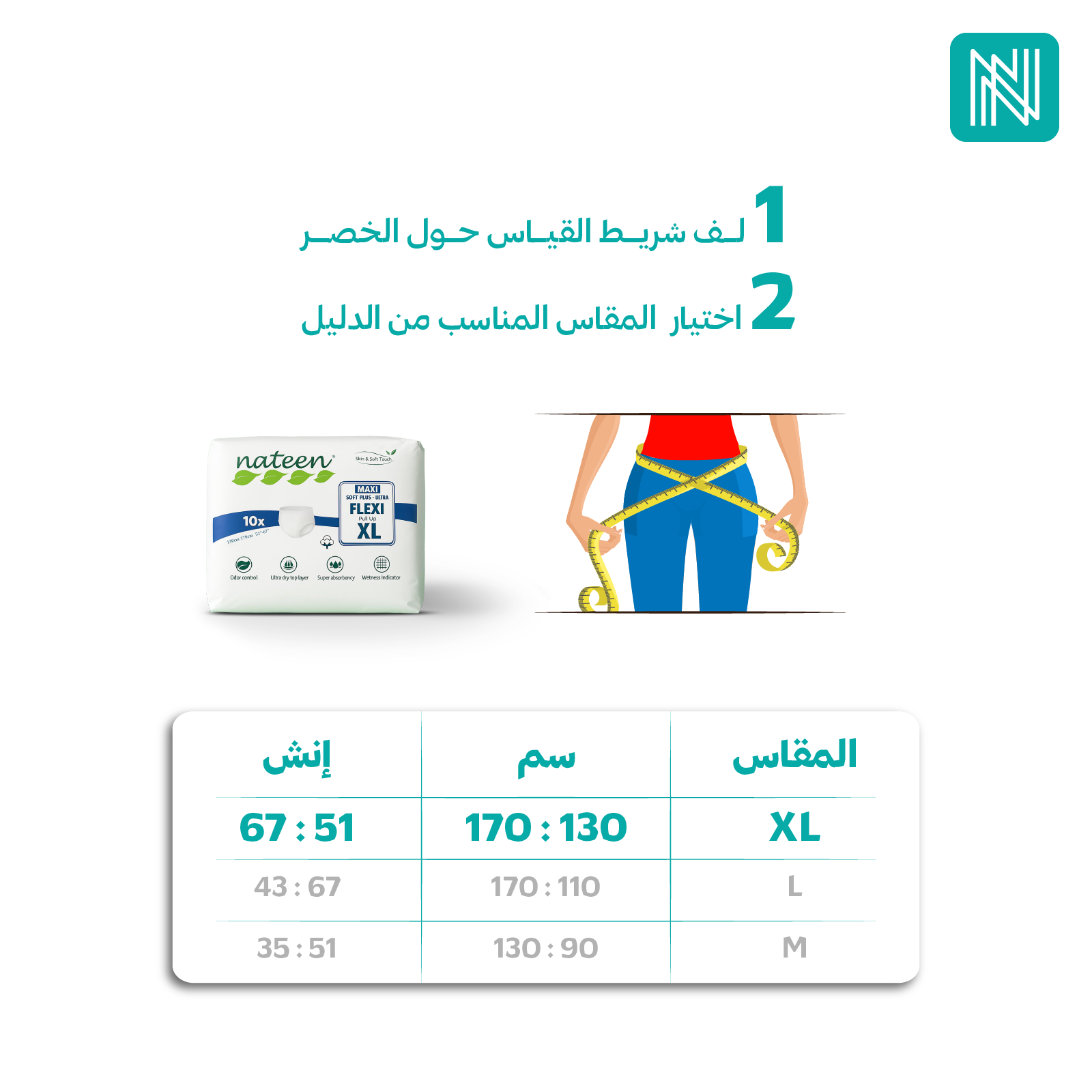 2- تأكد من اختيار المقاس المناسب للحفاض الشورت، وذلك بقياس محيط الخصر ومقارنته بجدول المقاسات المتاح.