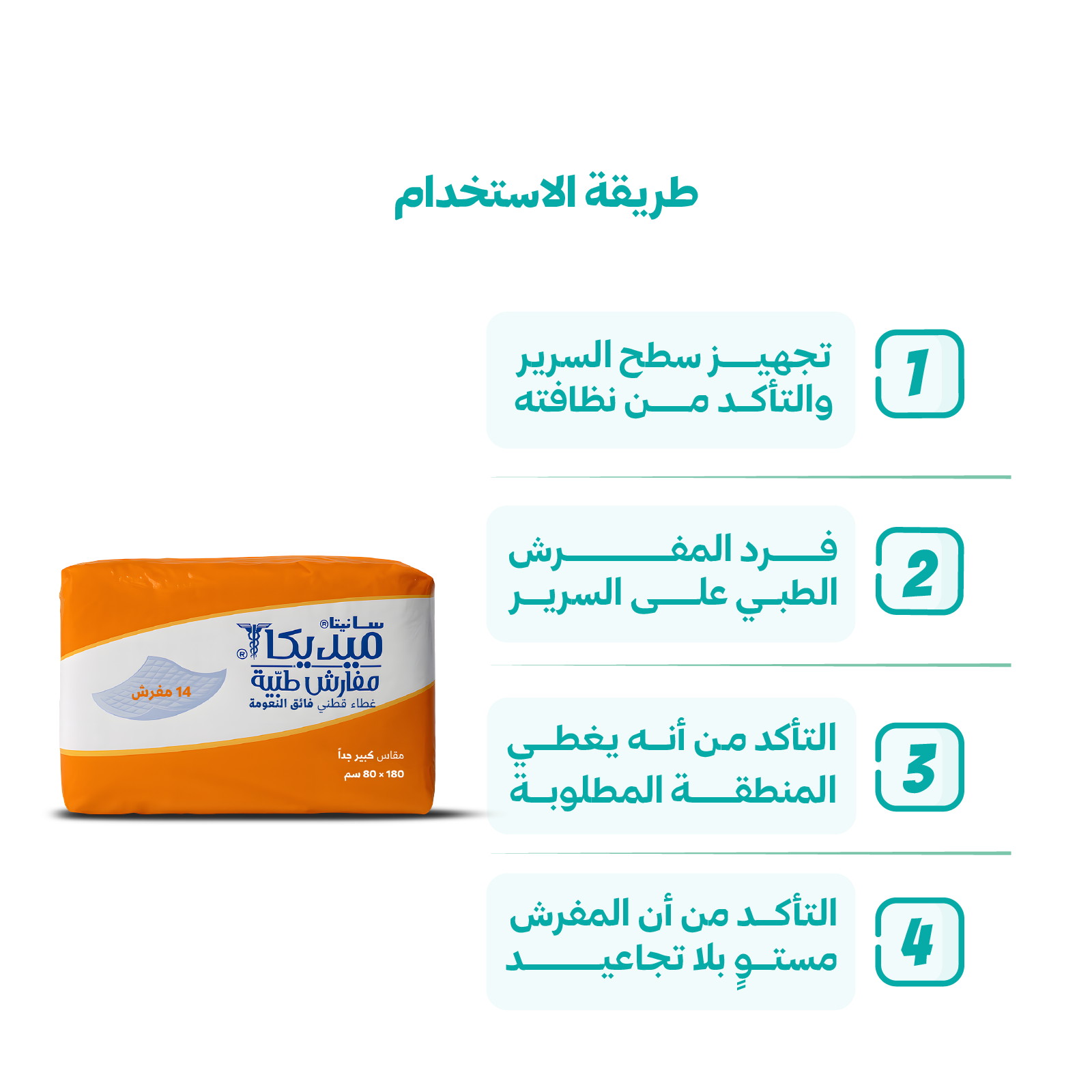 مفارش سانيتا الطبية هي خيارك الأمثل للحصول على حماية فائقة وراحة عند الاستخدام ، تتميز بطبقتين امتصاص، وطبقة علوية من القطن الناعم، وطبقة نايلون عازلة للسوائل.