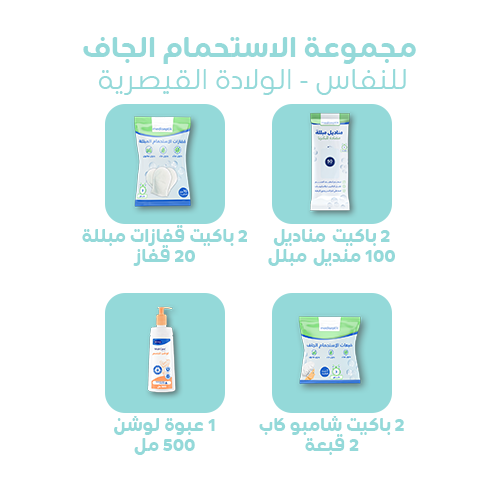 استمتعي بالنظافة والانتعاش دون تعريض جرح القيصرية لأي ضرر، مع مجموعة الاستحمام بدون ماء المصممة خصيصًا لتوفير العناية الكاملة لكِ بعد الولادة أو في الحالات التي يصعب فيها استخدام الماء.