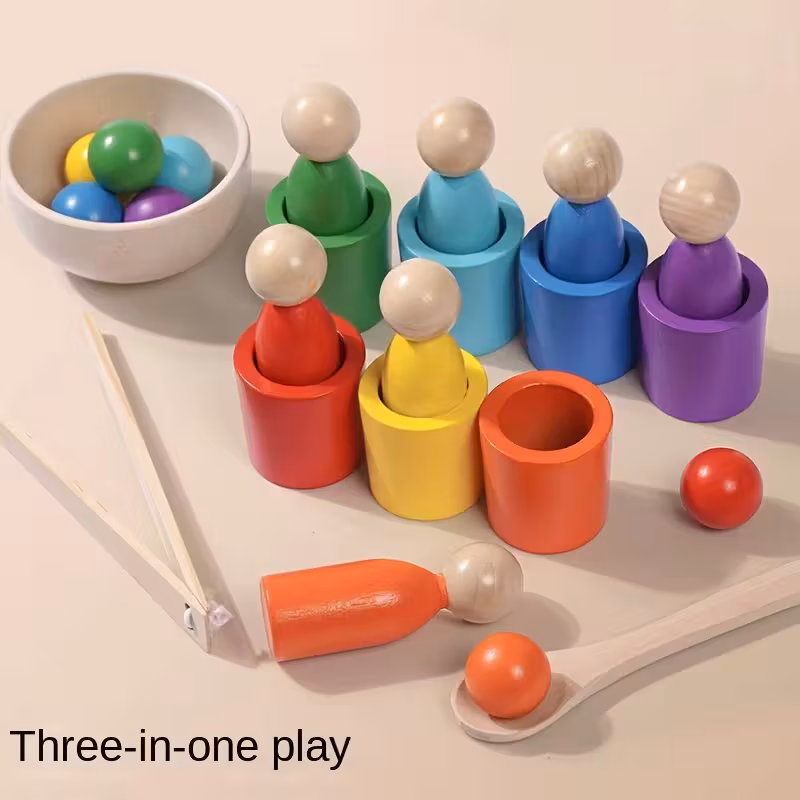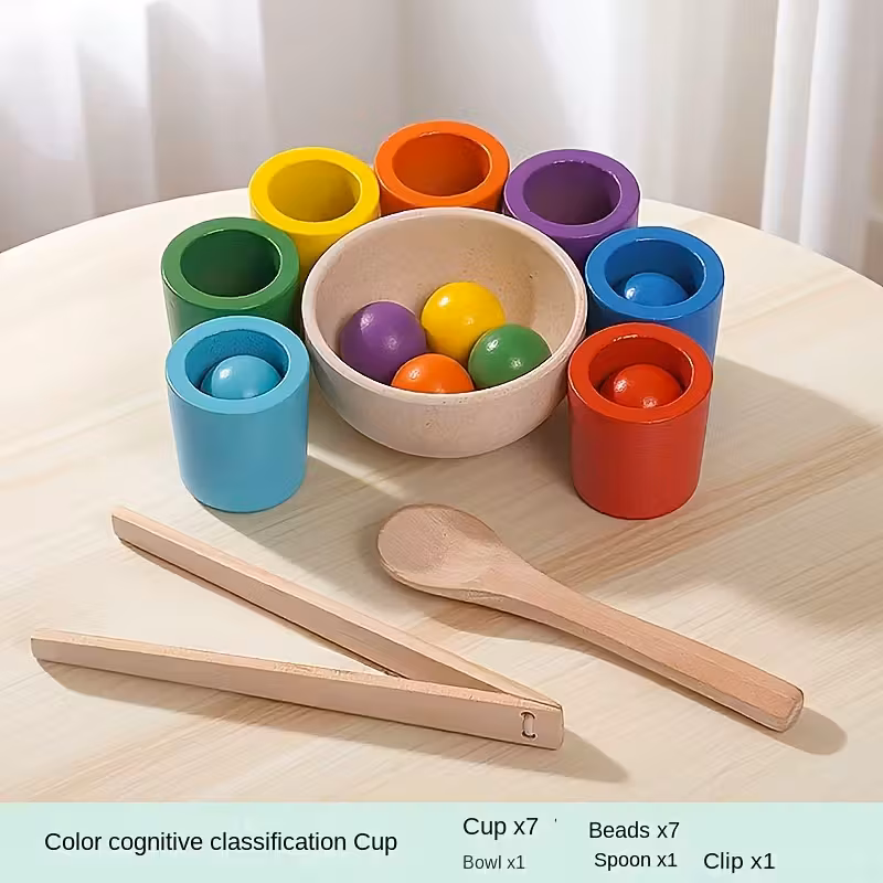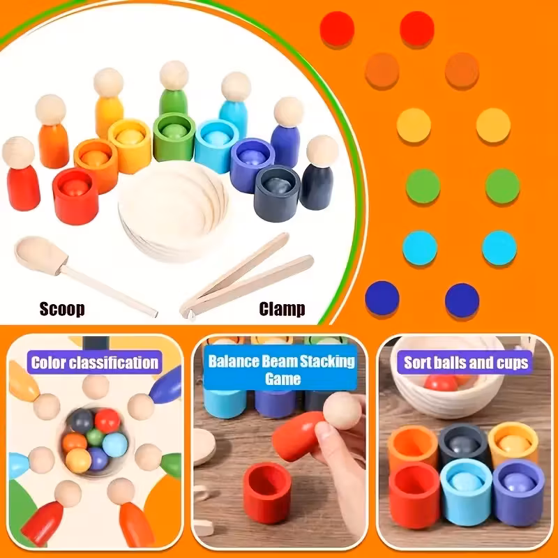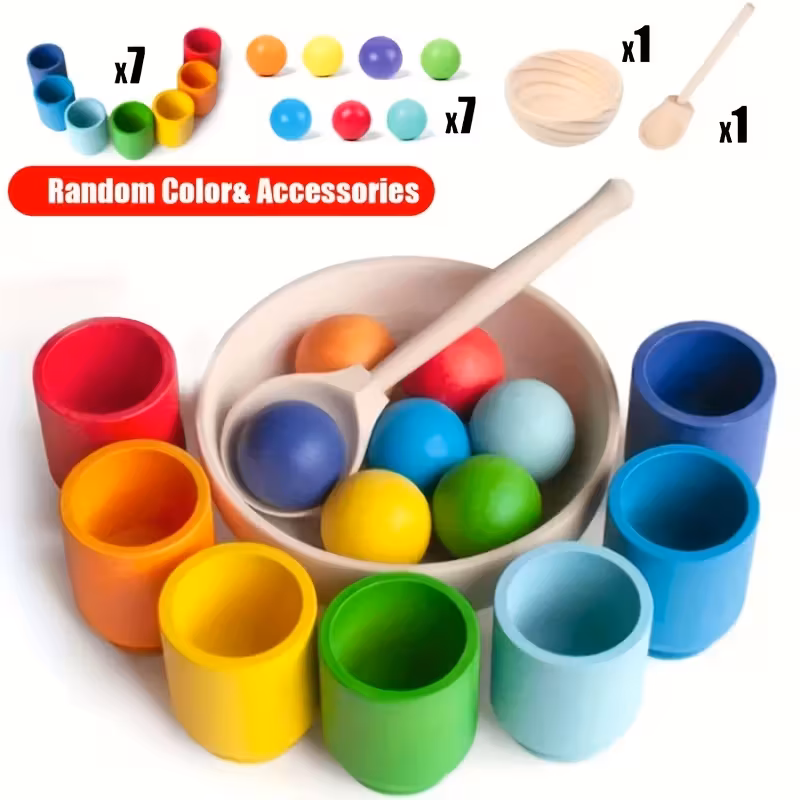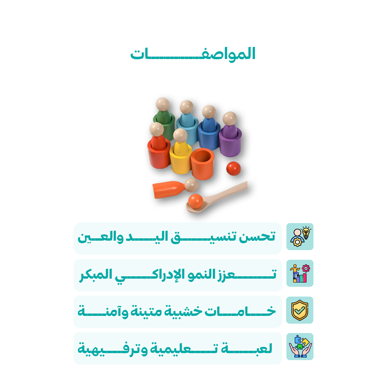 لعبة تعليمية للأطفال مصنوعة من الخشب، تتكون من كرات ملونة وأكواب مطابقة للفرز.