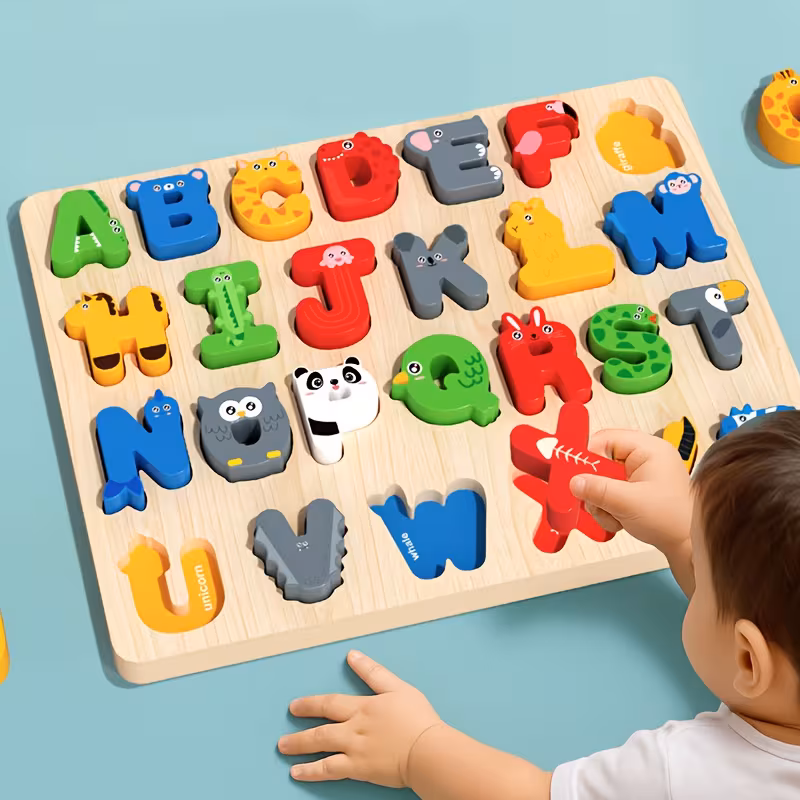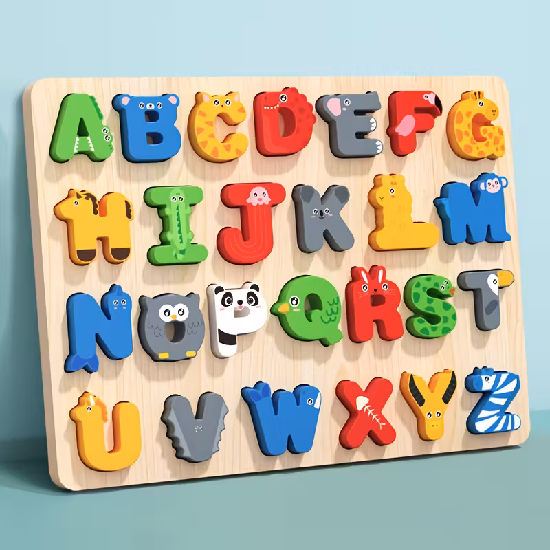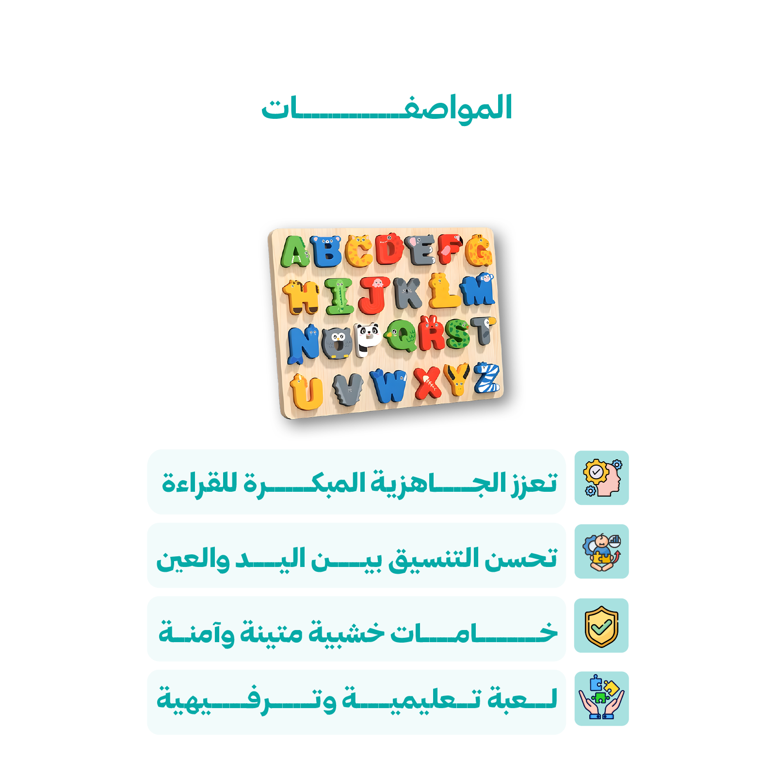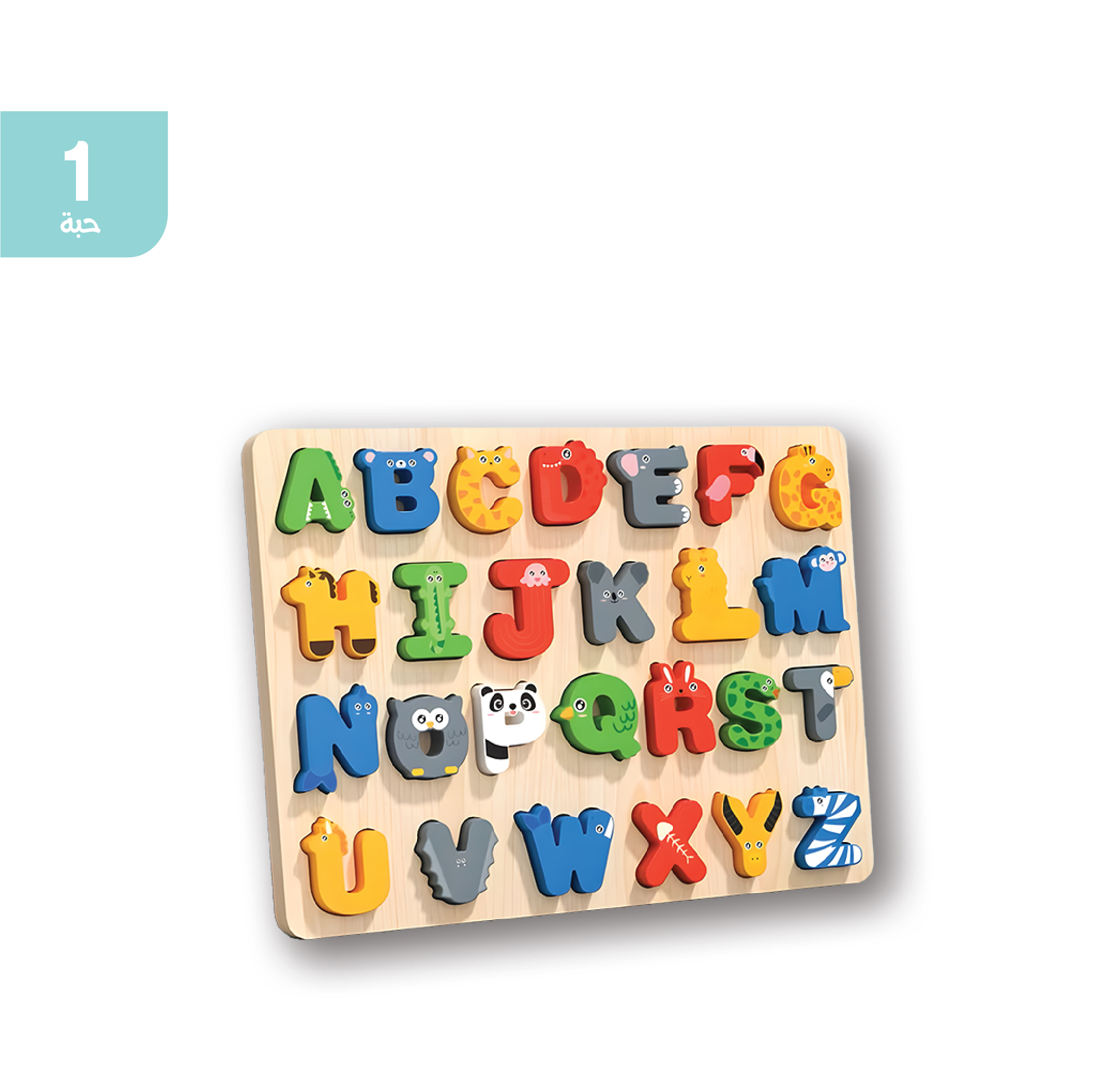 لعبة تعليمية خشبية تحتوي على حروف وأشكال مناسبة لمساعدة الأطفال على تعلم الحروف ومهارات التعرف الأساسية بطريقة مرحة وتفاعلية.
