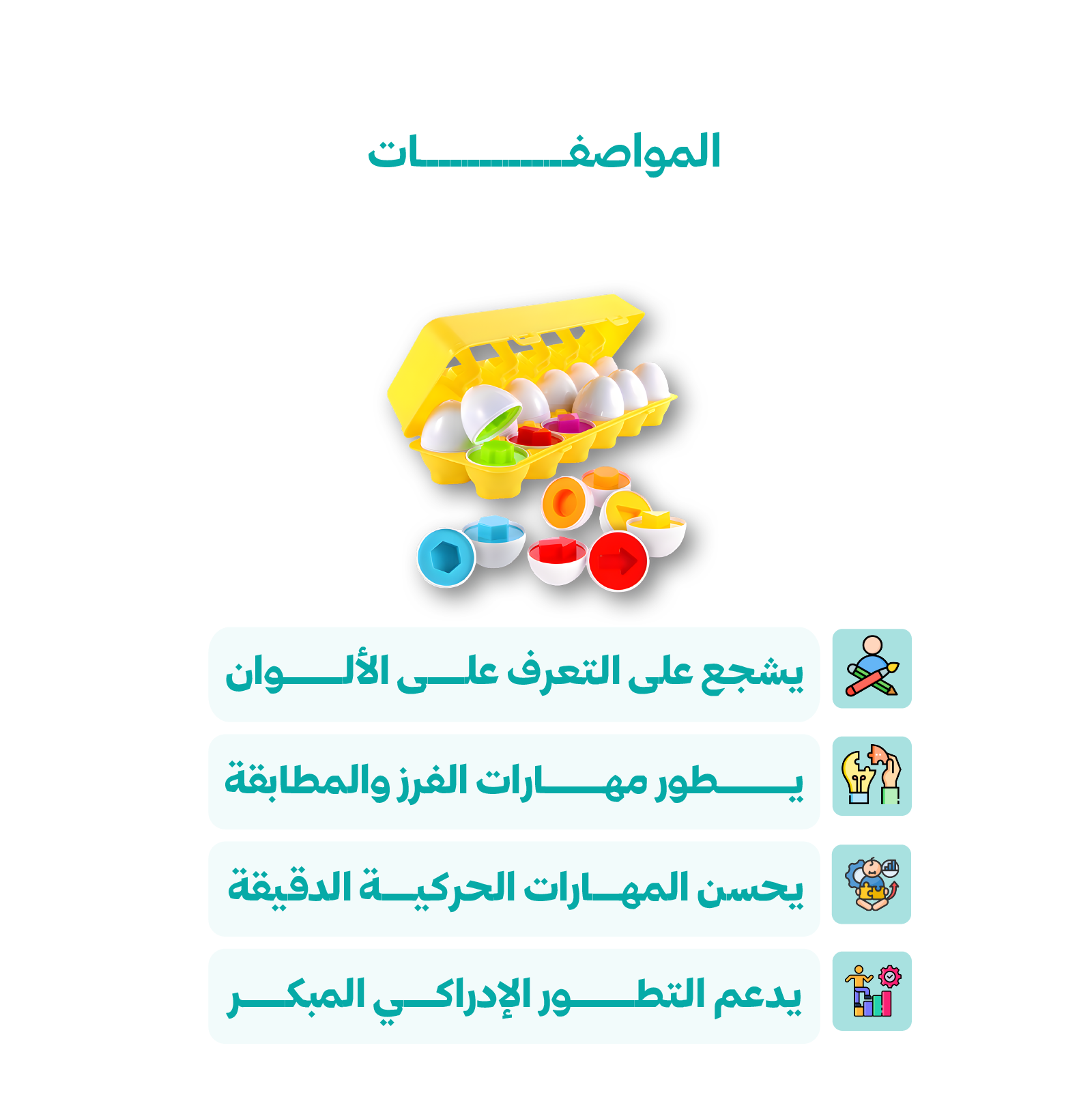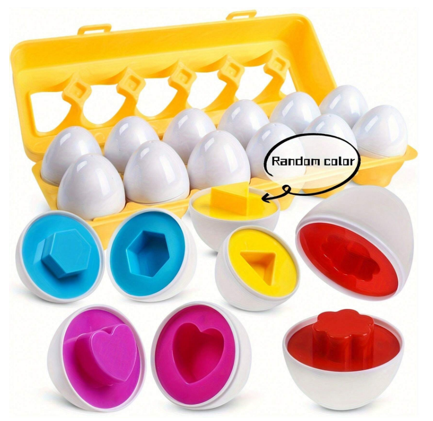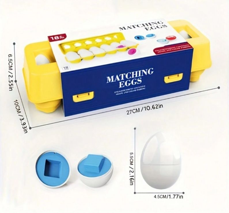 لعبة ألغاز تعليمية وترفيهية على شكل بيض، مصممة للأطفال الصغار ومرحلة ما قبل المدرسة. تتضمن المجموعة 12بيضة ملونة، يفتح كل منها إلى قطع بأشكال وألوان مميزة، ليتمكن الأطفال من مطابقتها وإعادة تركيبها.