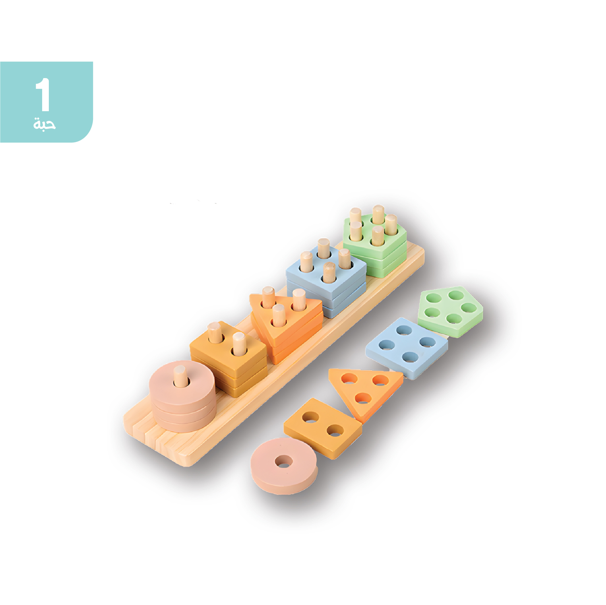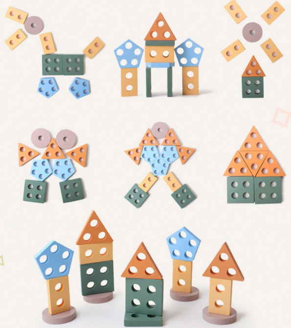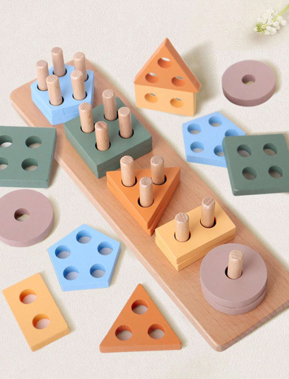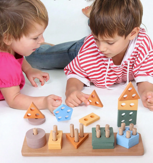 لعبة بناء خشبية على طراز مونتيسوري مصممة للأطفال الصغار لتشجيع مطابقة الأشكال، الاستكشاف الحسي، وتطوير المهارات الحركية الدقيقة بطريقة ممتعة وتفاعلية.