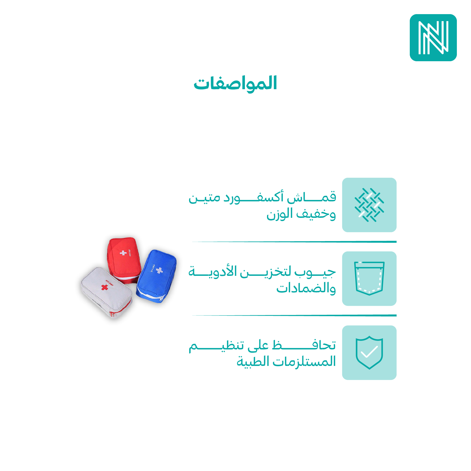 حقيبة طبية مثالية لحفظ مستلزمات الإسعافات الأولية. مصنوعة من قماش أكسفورد المتين، خفيفة الوزن، صغيرة الحجم، وتحتوي على عدة جيوب لتنظيم المستلزمات الطبية الأساسية. مثالية للاستخدام في المنزل، السفر، السيارة، المكتب، والأنشطة الخارجية.
