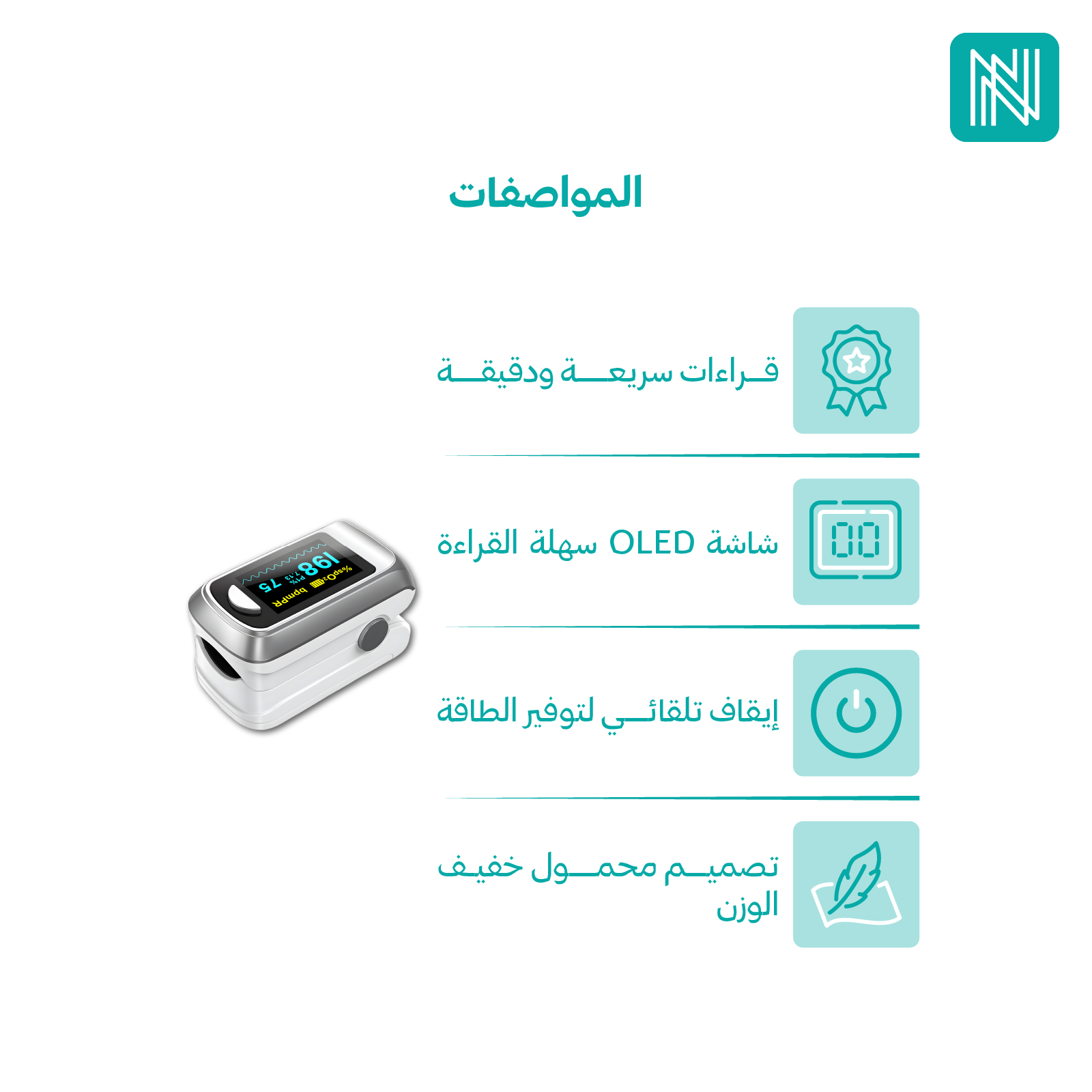 - قراءات سريعة ودقيقة: تظهر نتائج نسبة تشبع الأكسجين في الدم SpO₂ ومعدل النبض خلال ثوانٍ.