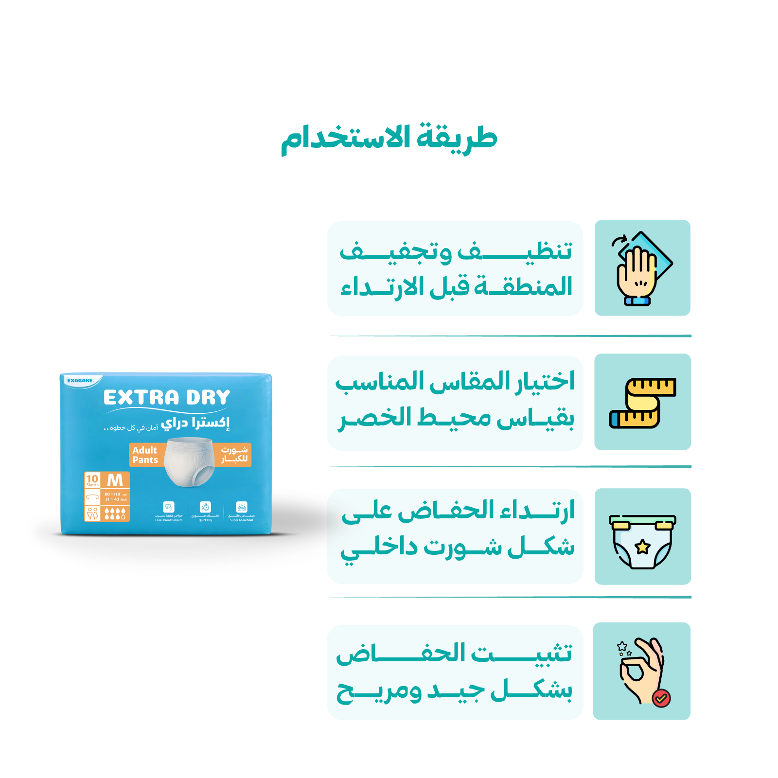 2- تأكد من اختيار المقاس المناسب لحفاض الشورت، وذلك بقياس محيط الخصر ومقارنته بجدول المقاسات المتاح.