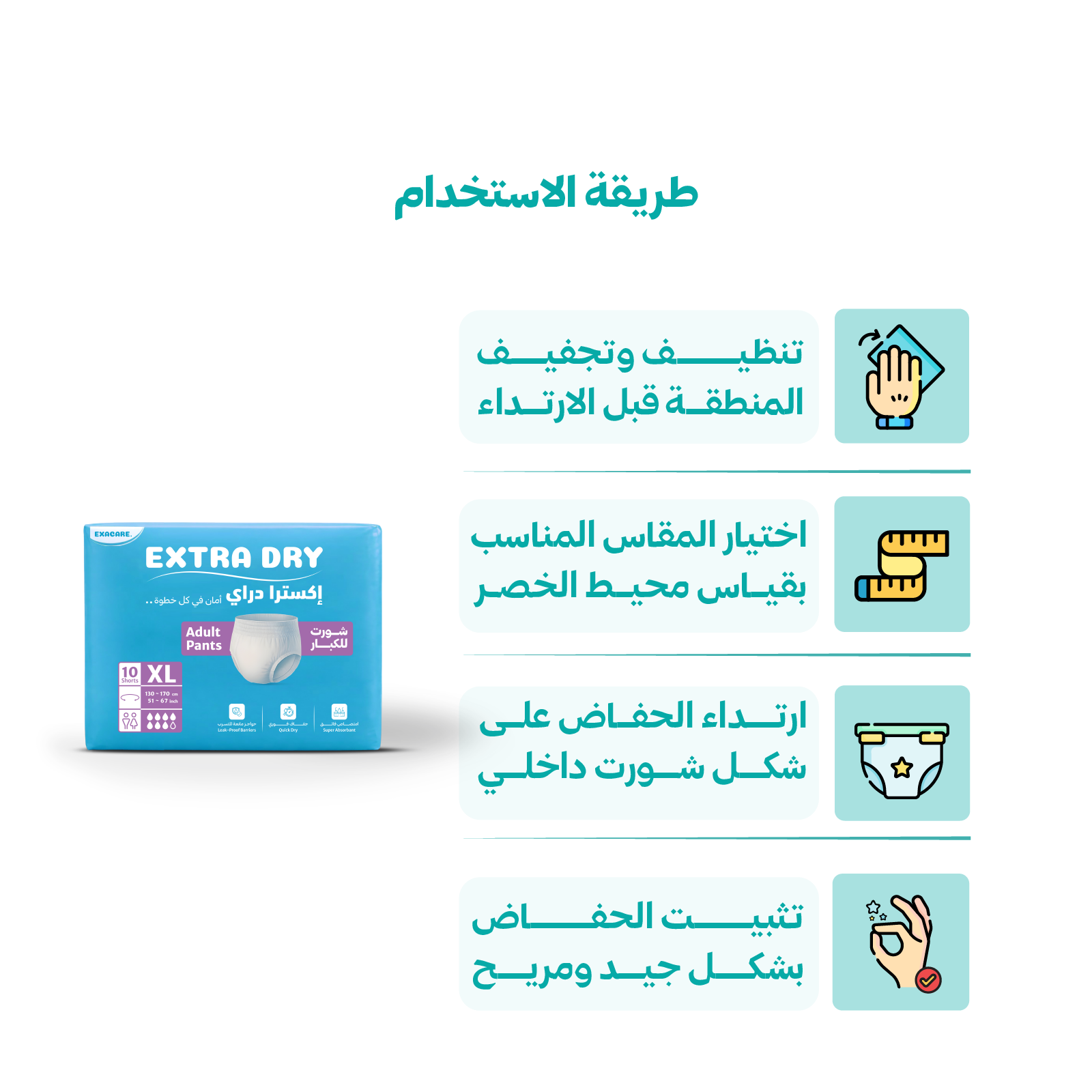 2- تأكد من اختيار المقاس المناسب لحفاض الشورت، وذلك بقياس محيط الخصر ومقارنته بجدول المقاسات المتاح.