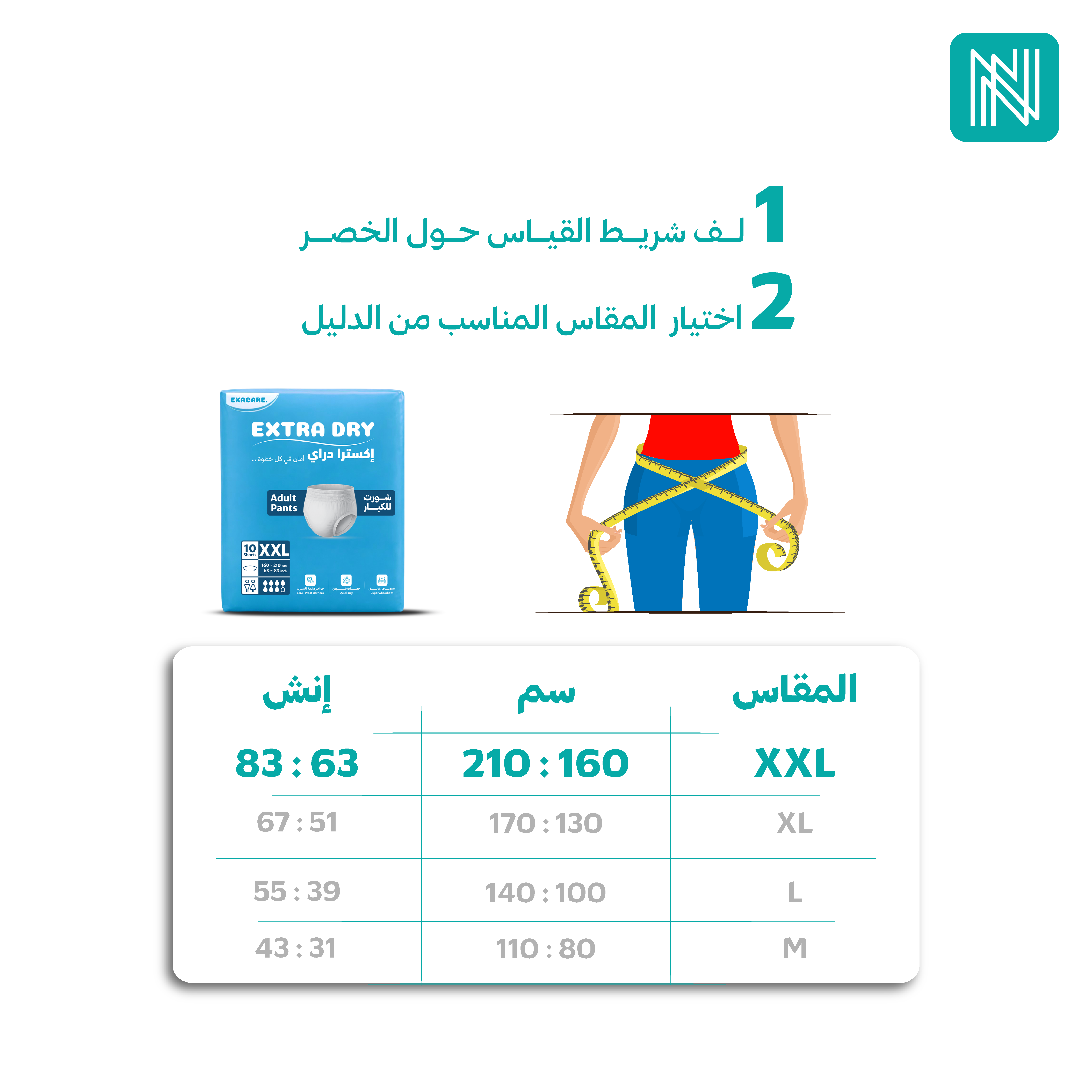 2- تأكد من اختيار المقاس المناسب لحفاض الشورت، وذلك بقياس محيط الخصر ومقارنته بجدول المقاسات المتاح.