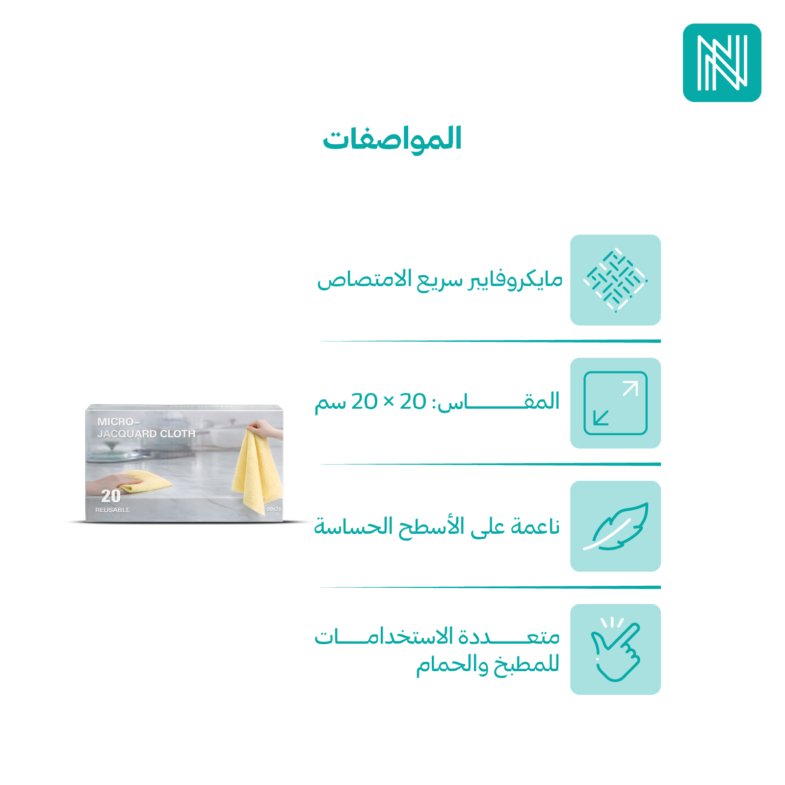 - الخامة: ألياف دقيقة مايكروفايبر عالية الامتصاص