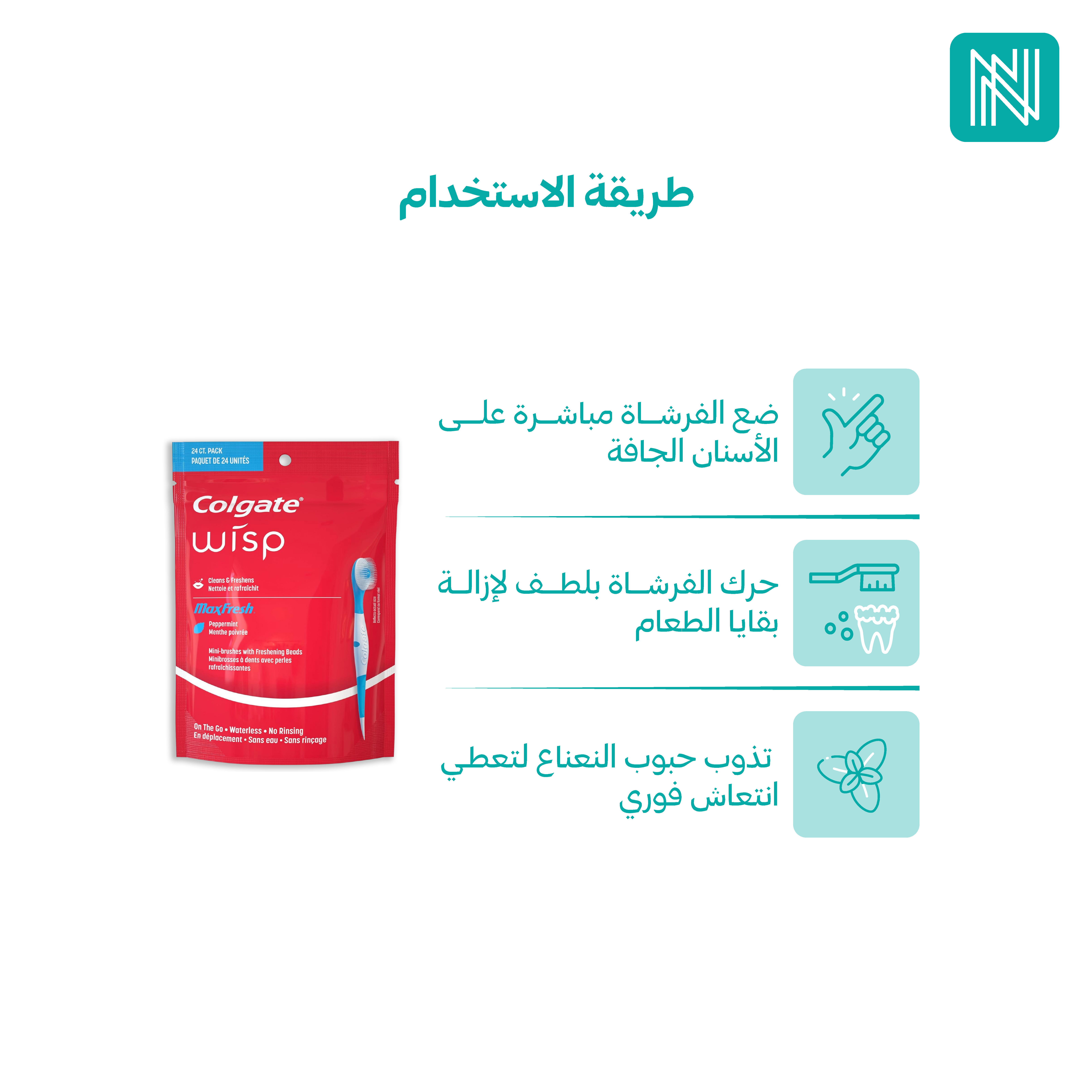 احصل على أسنان نظيفة ونفس منعش في أي وقت بدون ماء مع فرشاة كولجيت الصغيرة بنكهة النعناع المنعشة للاستخدام مرة واحدة.