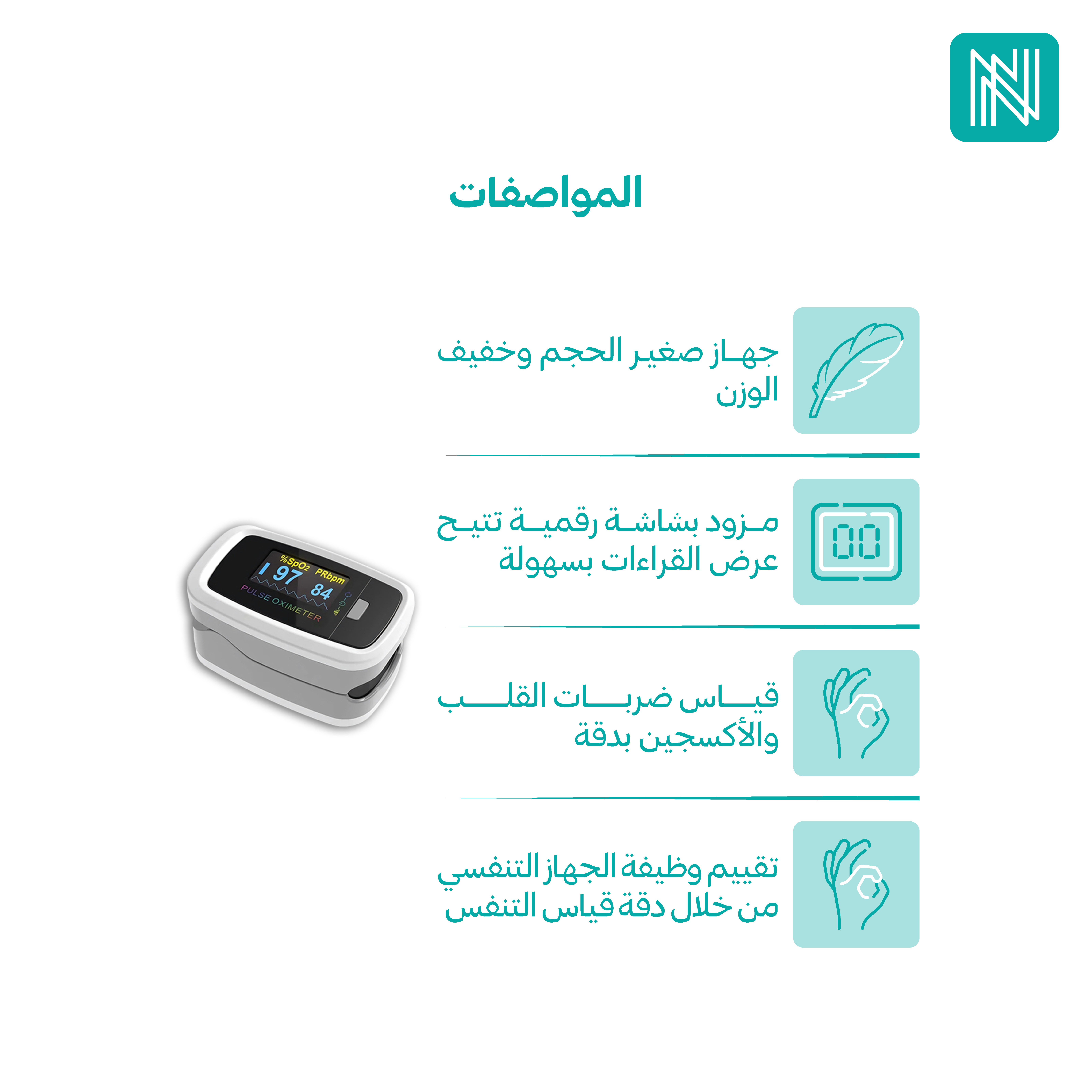 - قياس نسبة الأكسجين في الدم: يوفر الجهاز قراءات دقيقة لنسبة الأكسجين في الدم مما يعزز الوعي بمستوى التأكسج وصحة الجهاز التنفسي.