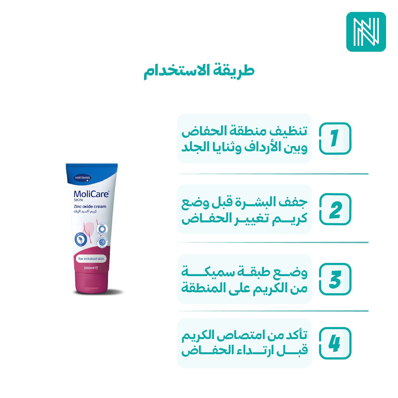 1- يُدهن الكريم كطبقة رقيقة مرتين يوميًا قبل ارتداء الحفاض.