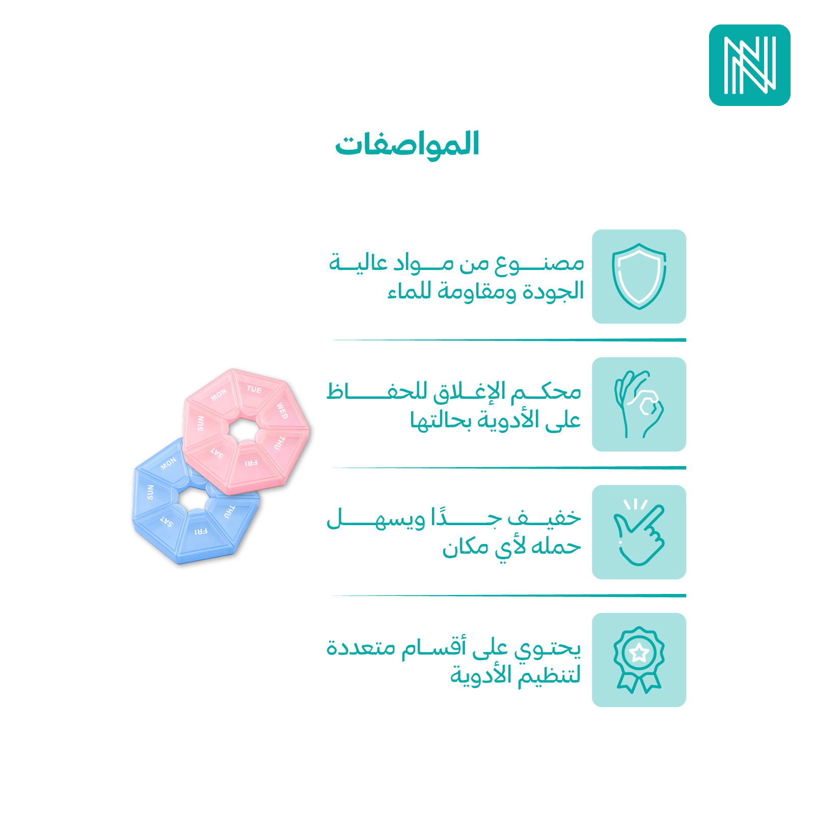 - آمن ومريح: مصنوع من مواد عالية الجودة تضمن الحفاظ على الأدوية بترتيب ونظافة.