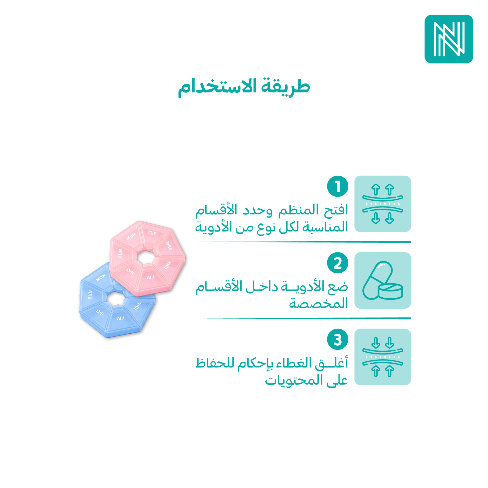 - احرص على إغلاق منظم الأدوية جيدًا بعد كل استخدام لتجنب حدوث أي تلوث.