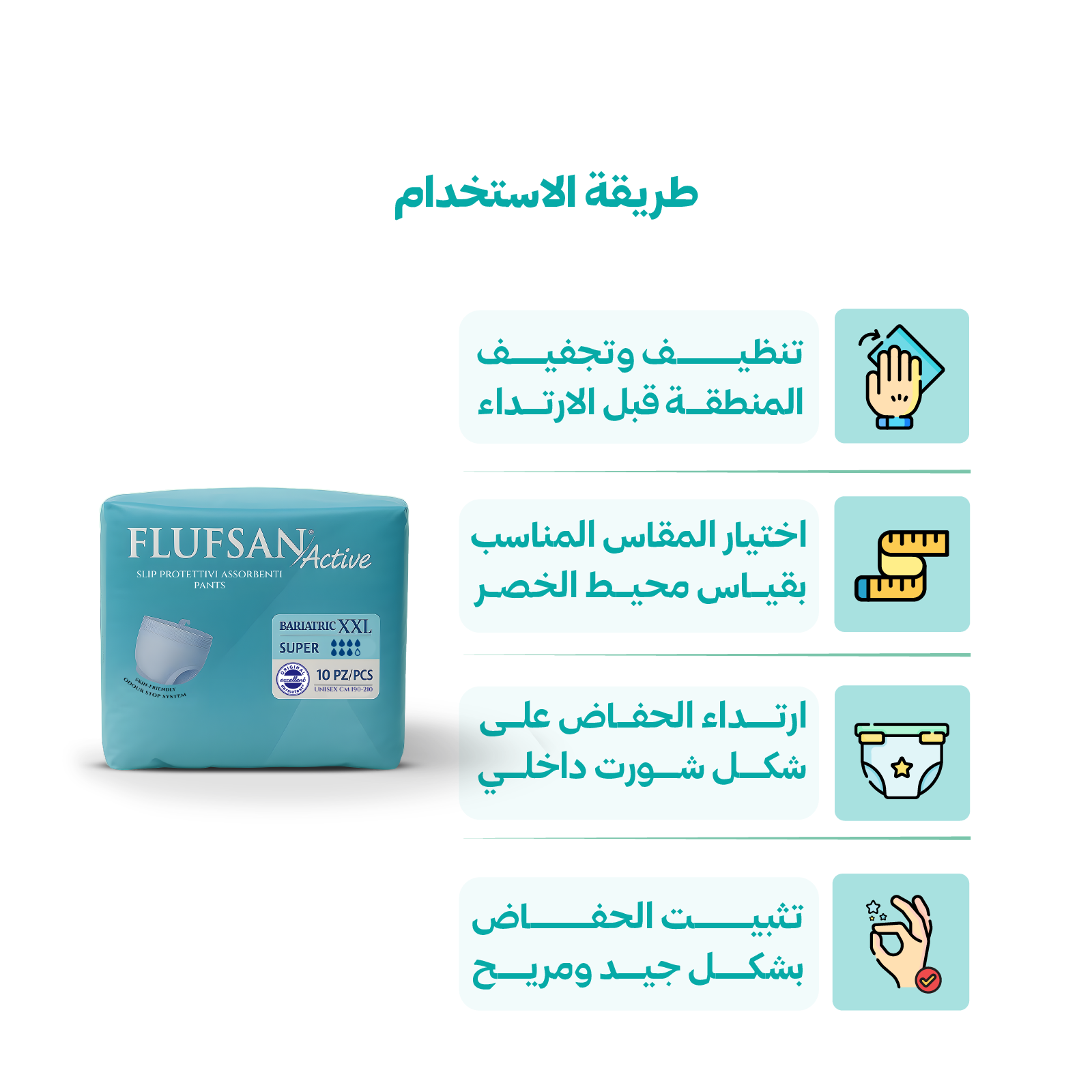 1- يجب تنظيف وتجفيف المنطقة جيدًا قبل الارتداء مع وضع كريم حفاض لحماية المنطقة.