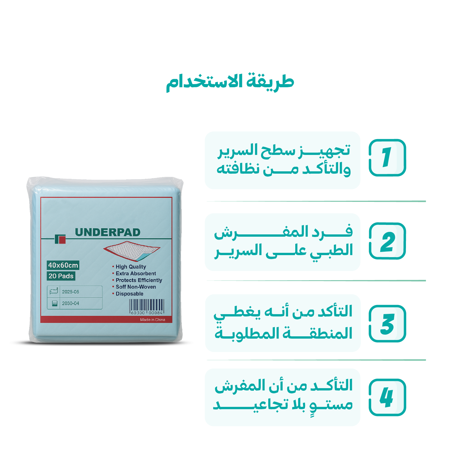 - يرجى التخلص من المفرش بعد الاستخدام وعدم إعادة استخدامه للحفاظ على النظافة والصحة.