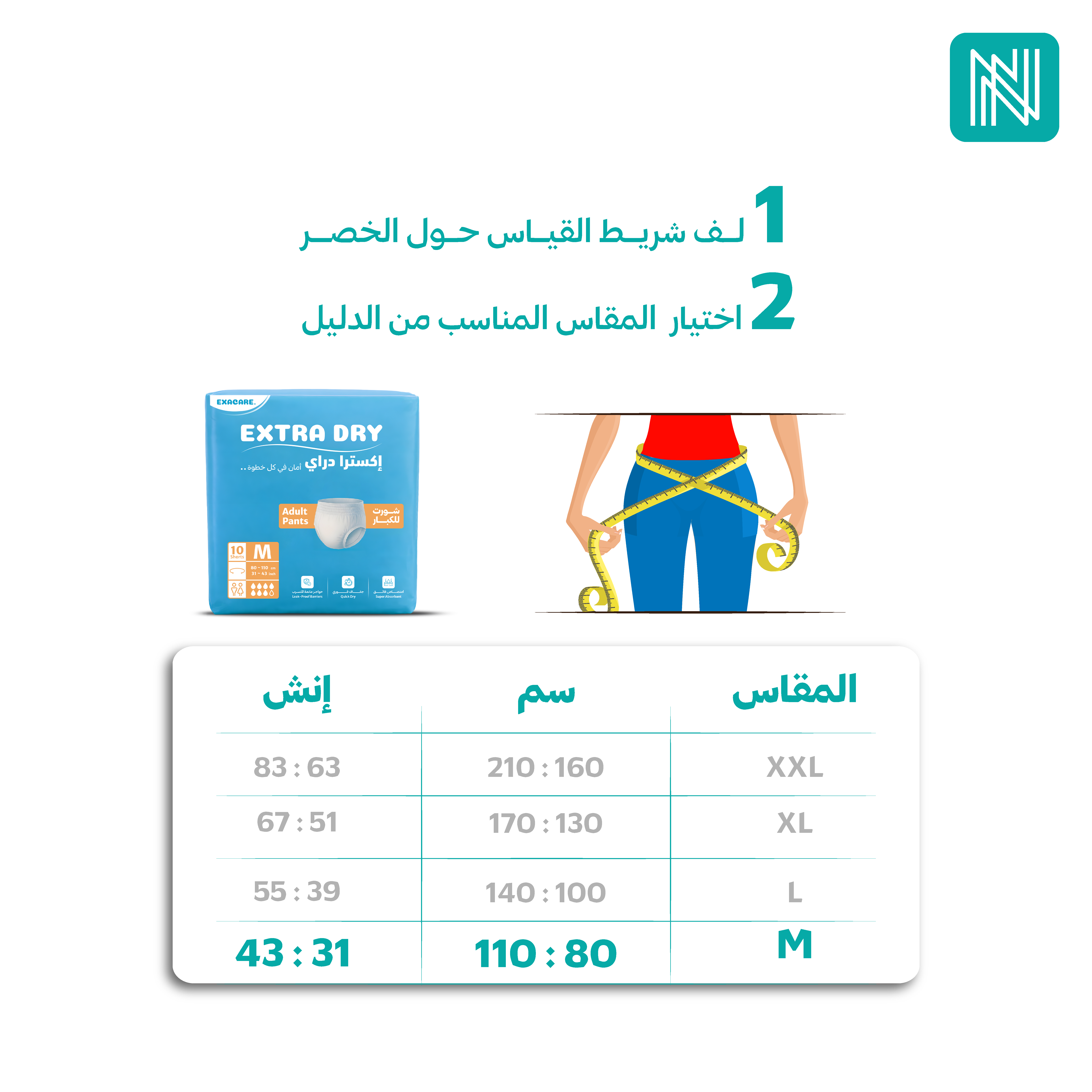 2- تأكد من اختيار المقاس المناسب لحفاض الشورت، وذلك بقياس محيط الخصر ومقارنته بجدول المقاسات المتاح.