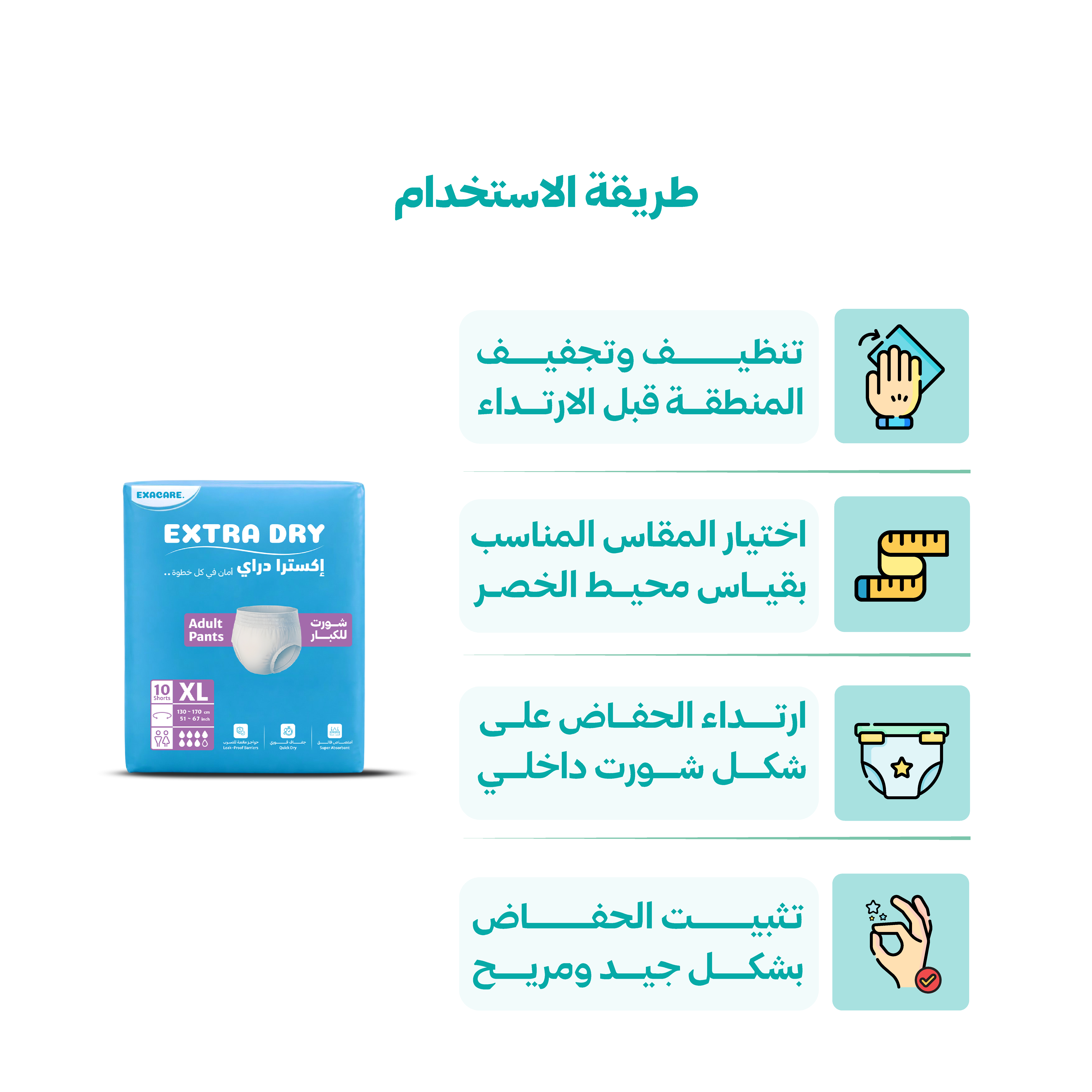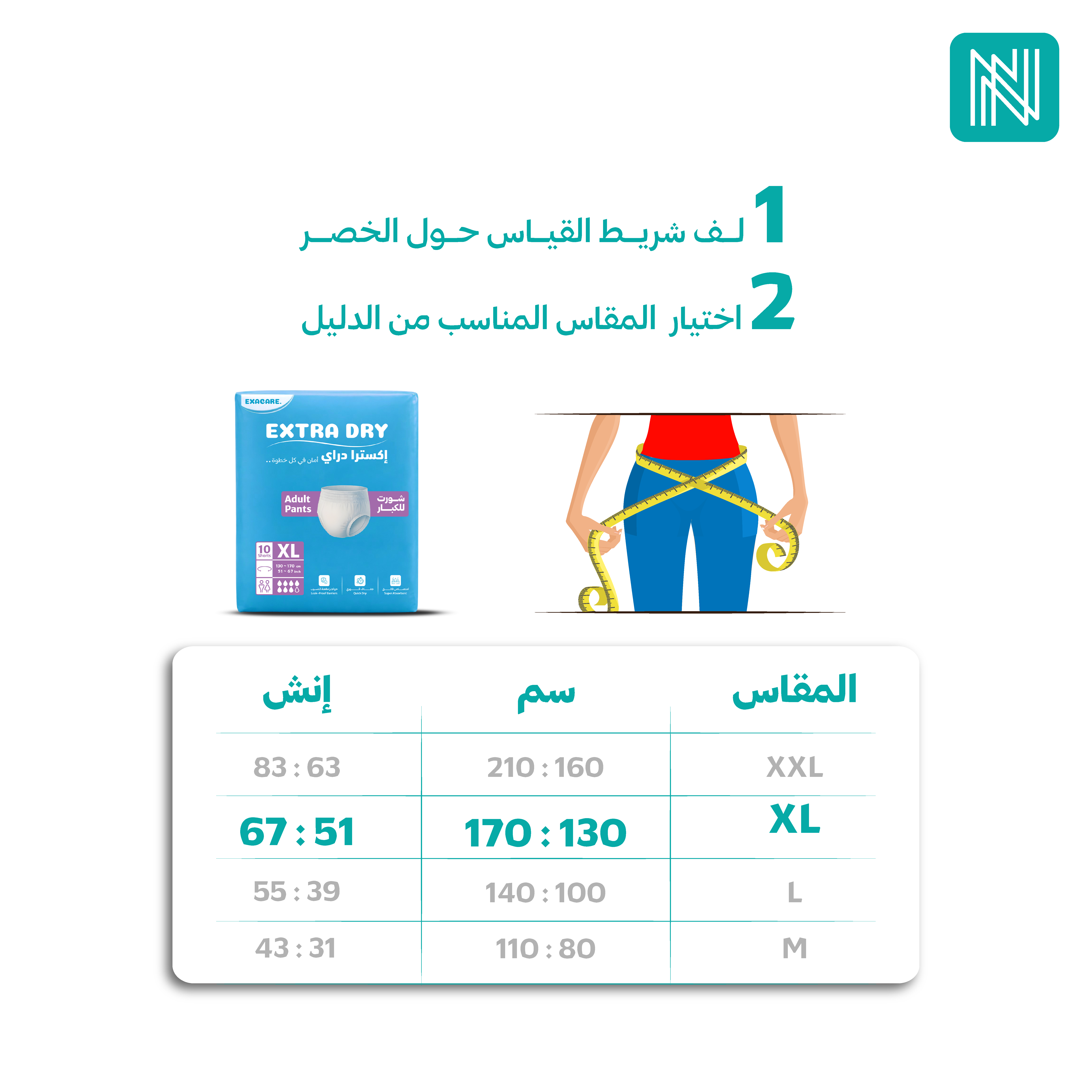 2- تأكد من اختيار المقاس المناسب لحفاض الشورت، وذلك بقياس محيط الخصر ومقارنته بجدول المقاسات المتاح.