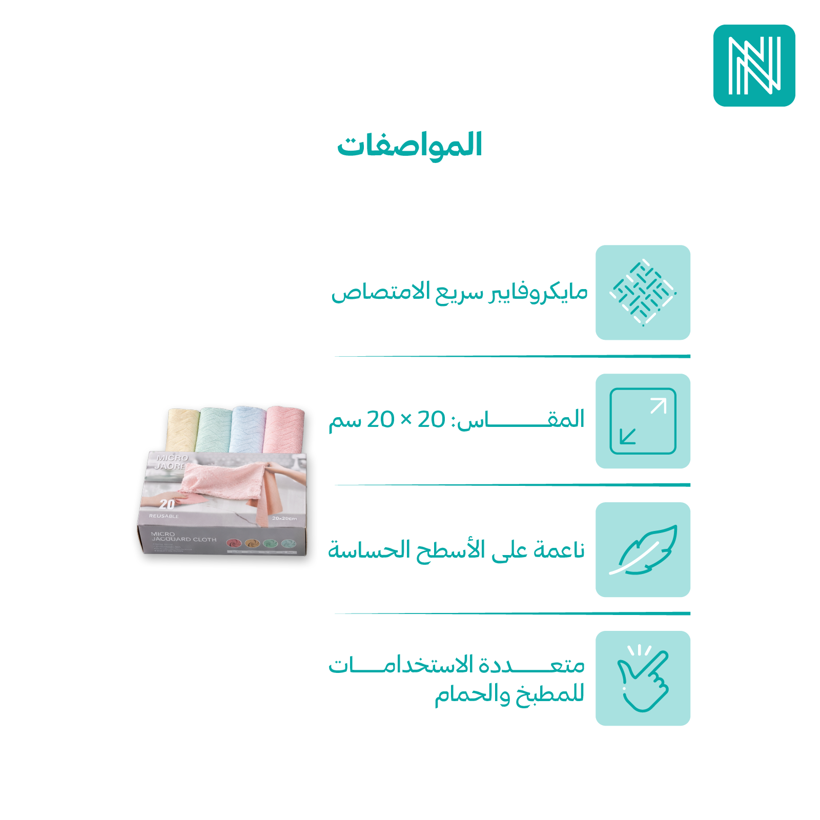 - الخامة: ألياف دقيقة مايكروفايبر عالية الامتصاص