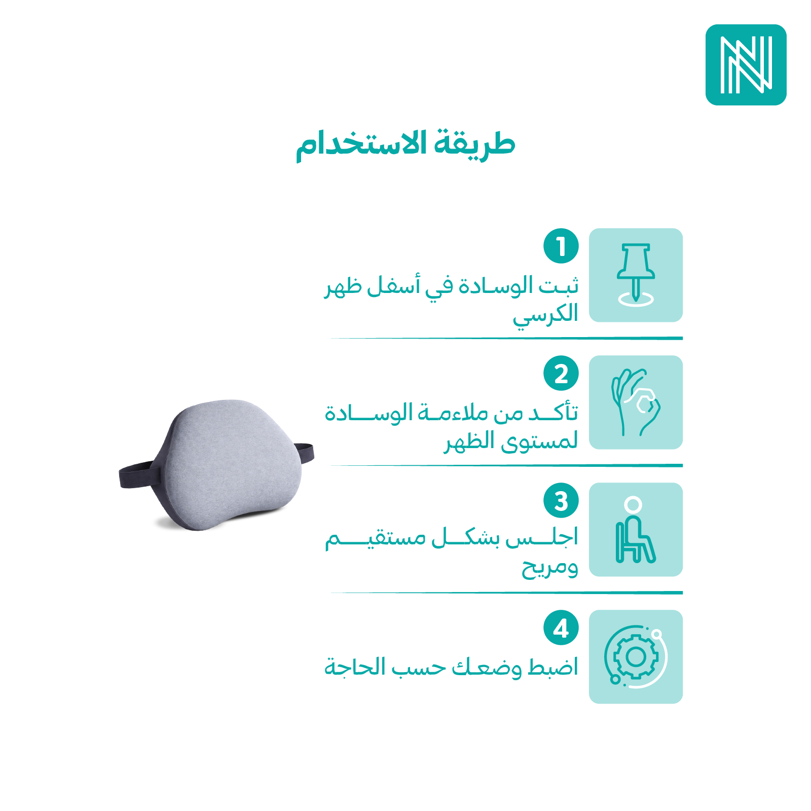1- ثبت الوسادة في أسفل ظهر الكرسي.
