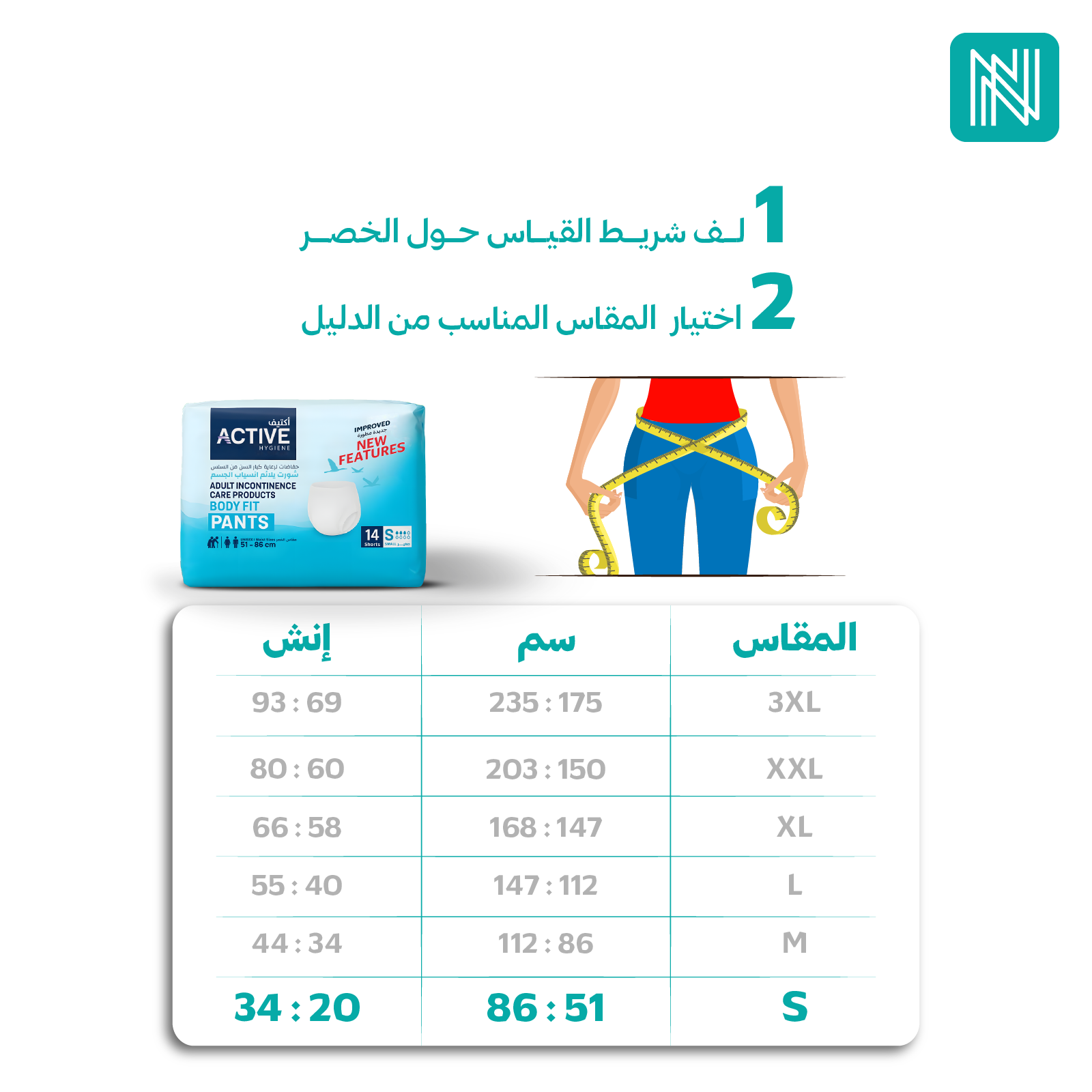 2- تأكد من اختيار المقاس المناسب للحفاض الشورت، وذلك بقياس محيط الخصر ومقارنته بجدول المقاسات المتاح.