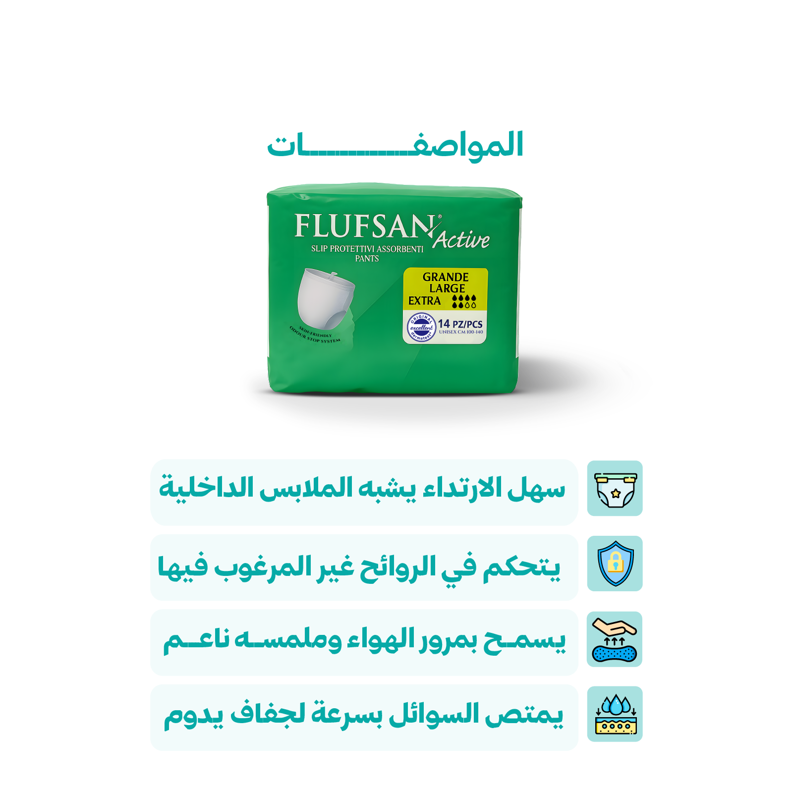 - شديد الامتصاص ويمتص السوائل بسرعة ليمنح جفاف يدوم طويلًا.