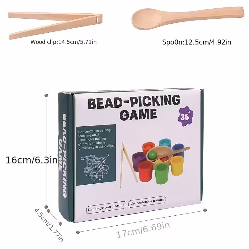 لعبة تعليمية للأطفال مصنوعة من الخشب، تتكون من كرات ملونة وأكواب مطابقة للفرز.