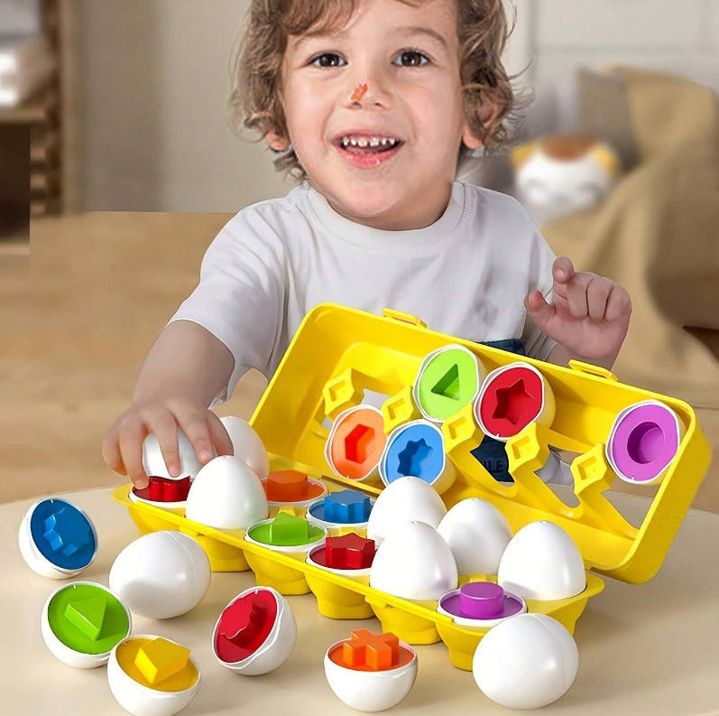 لعبة ألغاز تعليمية وترفيهية على شكل بيض، مصممة للأطفال الصغار ومرحلة ما قبل المدرسة. تتضمن المجموعة 12بيضة ملونة، يفتح كل منها إلى قطع بأشكال وألوان مميزة، ليتمكن الأطفال من مطابقتها وإعادة تركيبها.