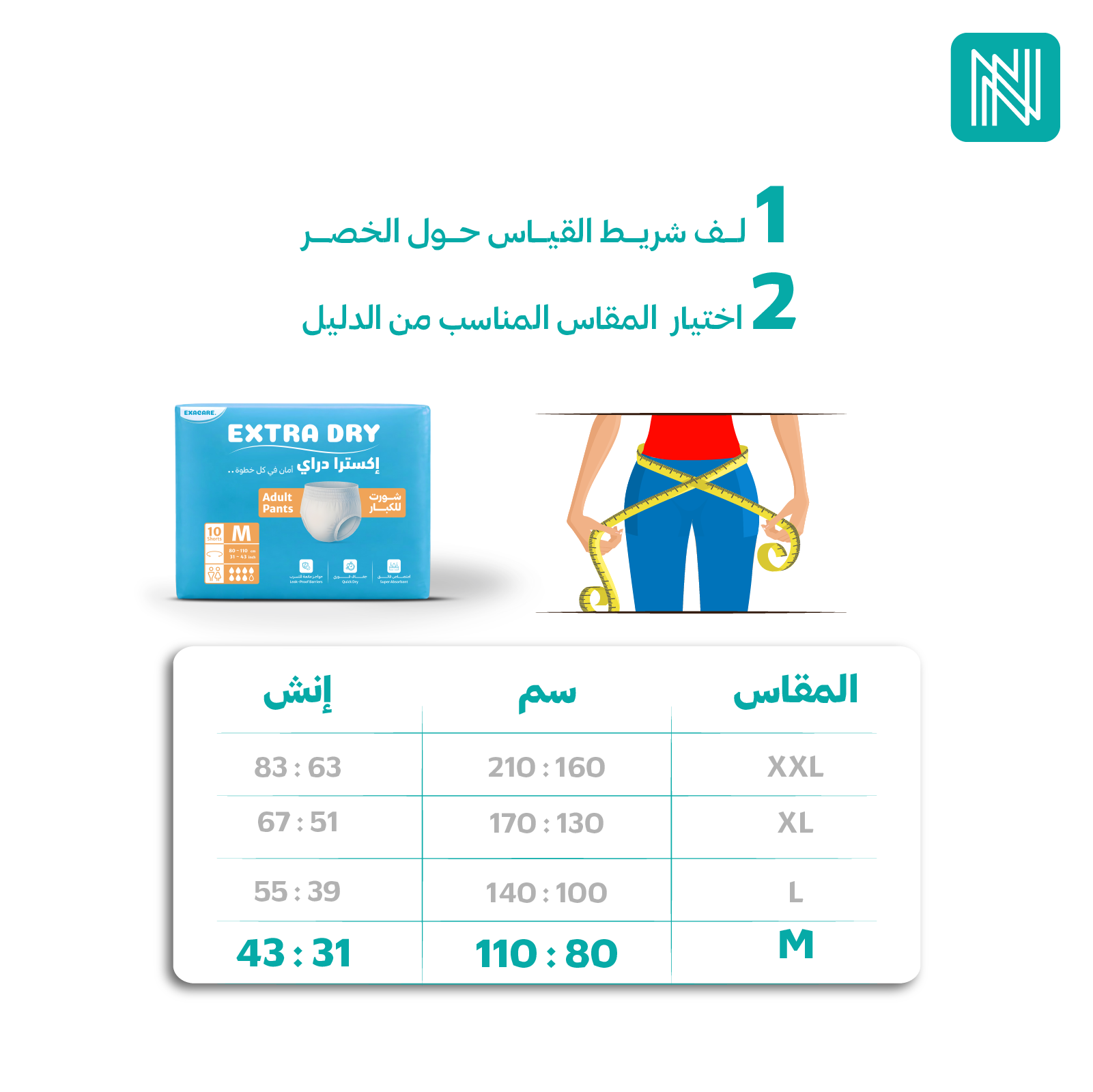 2- تأكد من اختيار المقاس المناسب لحفاض الشورت، وذلك بقياس محيط الخصر ومقارنته بجدول المقاسات المتاح.