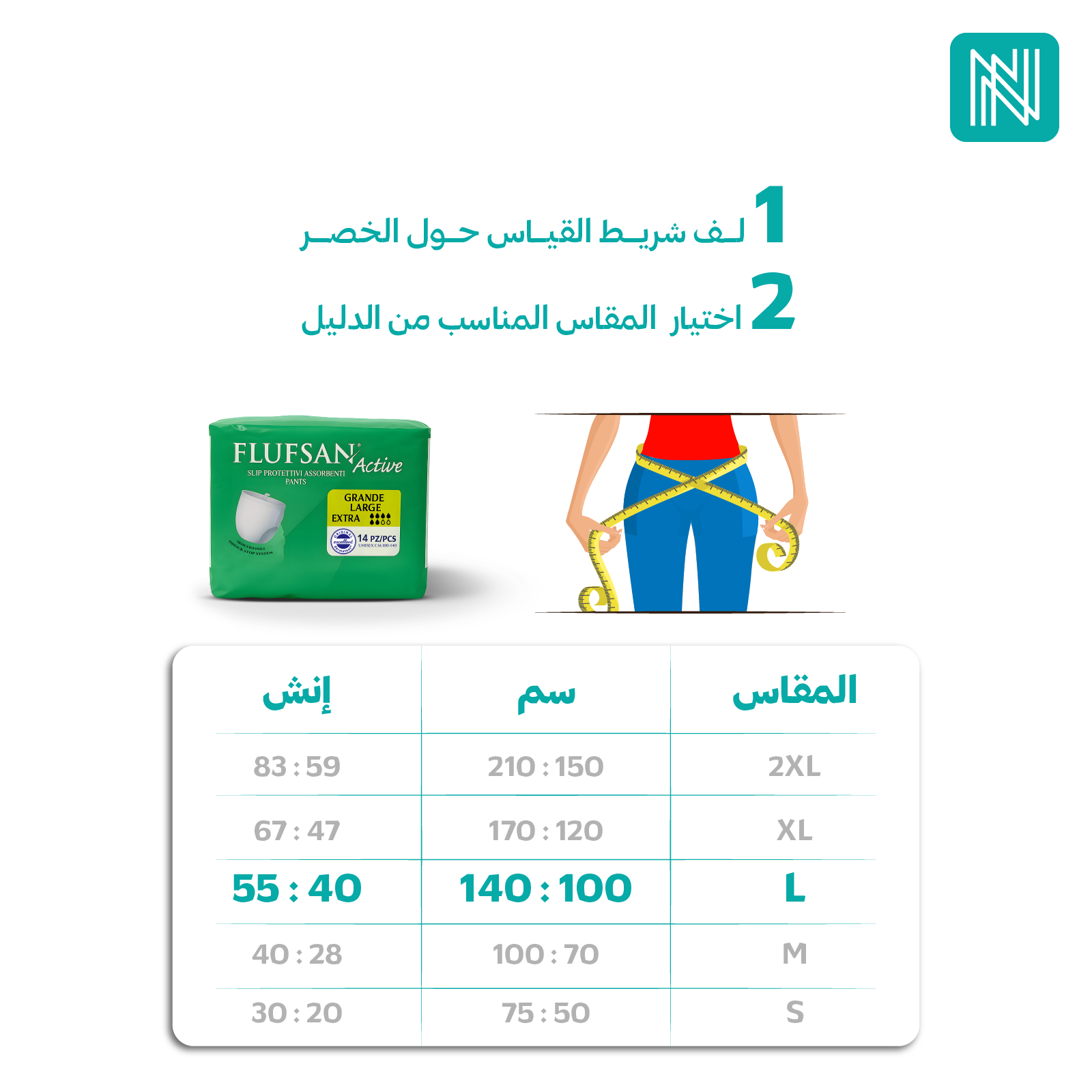 2- تأكد من اختيار المقاس المناسب لحفاض الشورت، وذلك بقياس محيط الخصر ومقارنته بجدول المقاسات المتاح.