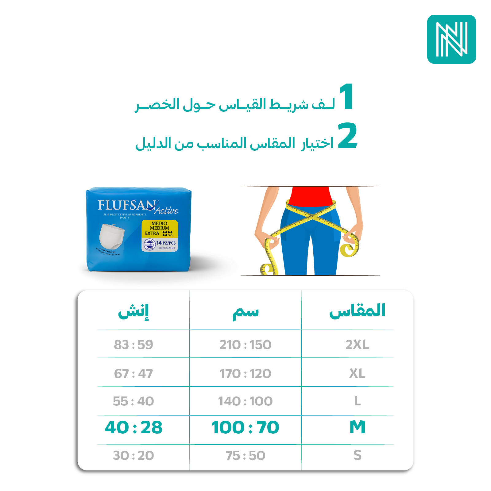 2- تأكد من اختيار المقاس المناسب لحفاض الشورت، وذلك بقياس محيط الخصر ومقارنته بجدول المقاسات المتاح.