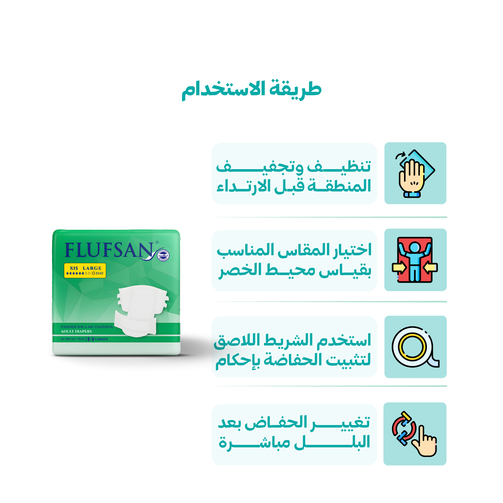 1- قُم بتنظيف وتجفيف الجلد قبل ارتداء حفاض 'فلوفاسان'.