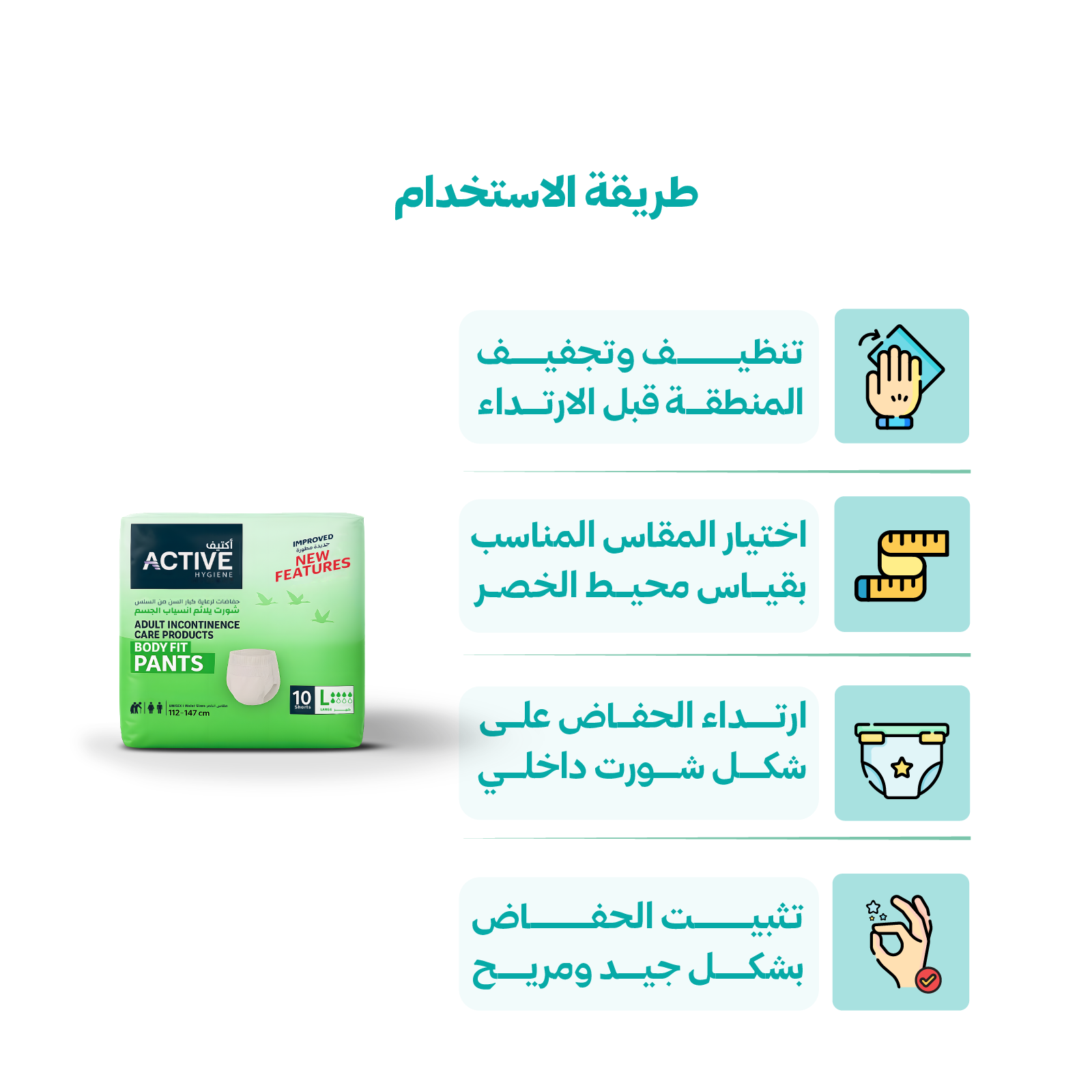 4- تأكد من أن الحفاض الشورت قد تم تثبيته بشكل جيد وأنه يتناسب مع جسم الشخص بشكل مريح.