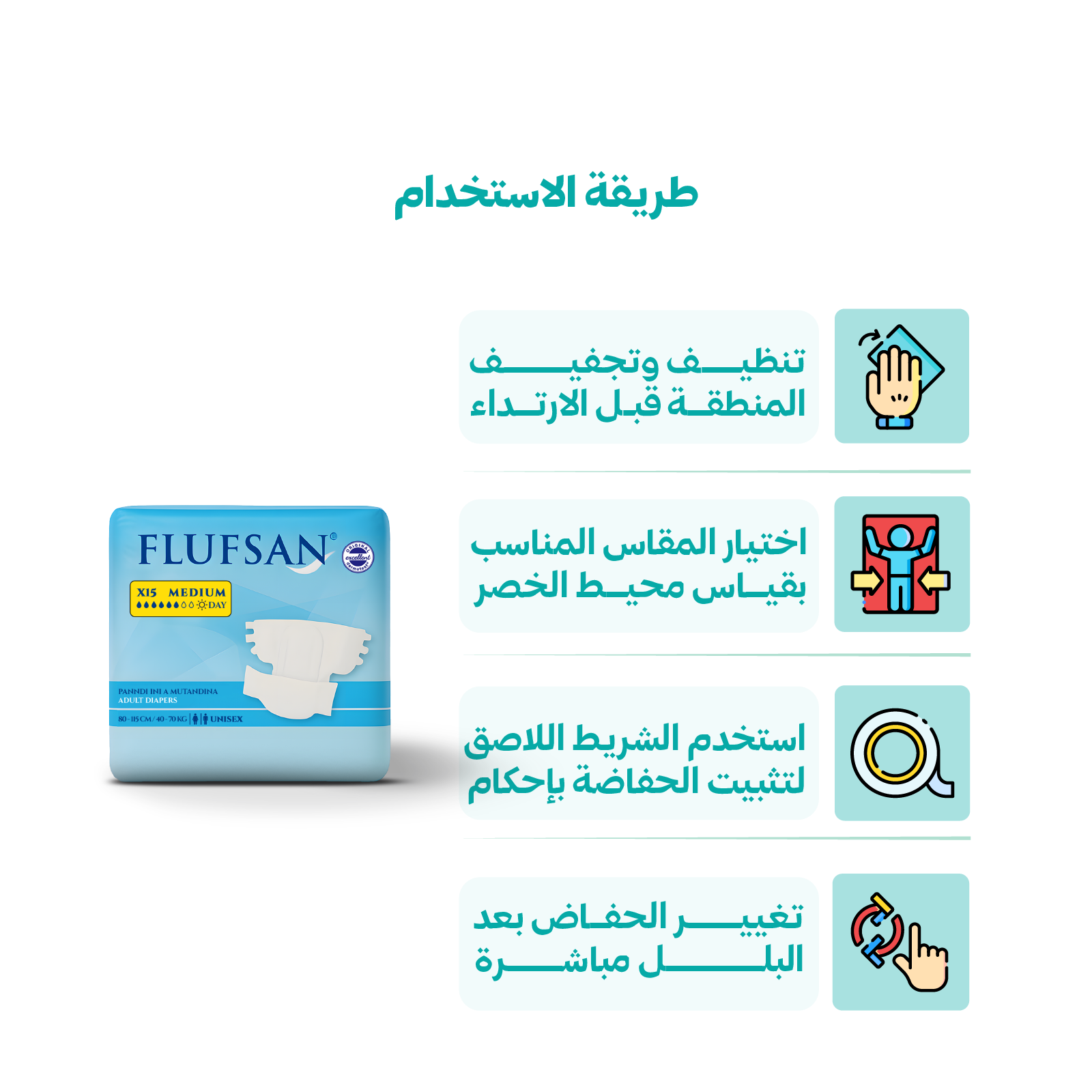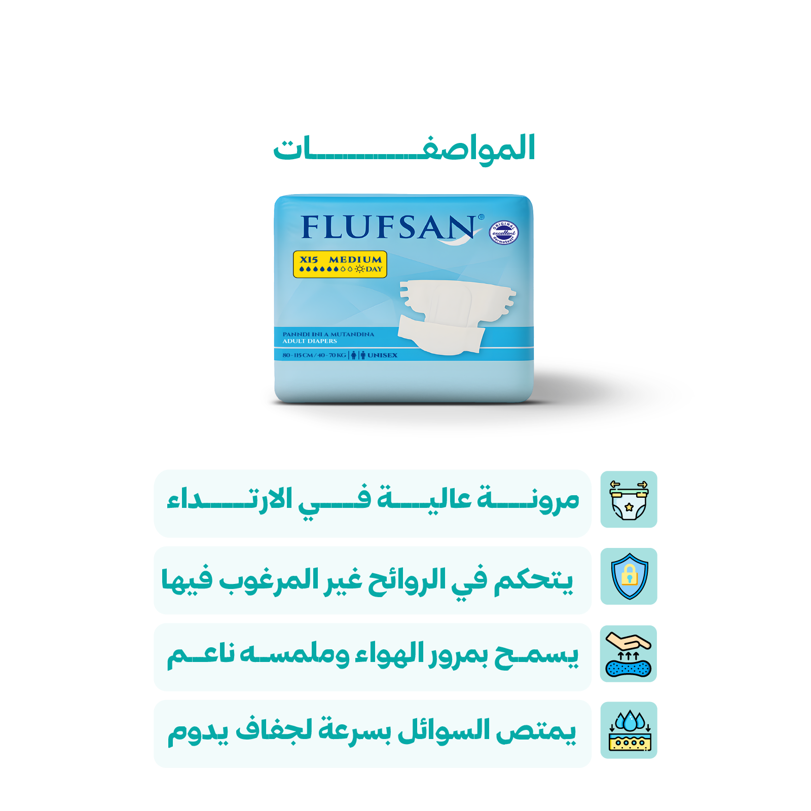 - مرونة في الارتداء: صُمِّمت حفاضات 'فلوفاسان' بمرونة عالية، مما يوفر حلاً ملائمًا ومريحًا يتكيف مع شكل الجسم وحركته الطبيعية.