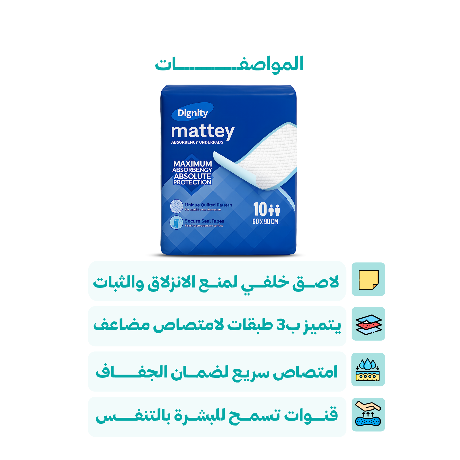 - 3 طبقات امتصاص: تحتوي المفارش على 3 طبقات امتصاص تعمل بفعالية على امتصاص السوائل والبقع، مما يساعد في الحفاظ على الجفاف والراحة.