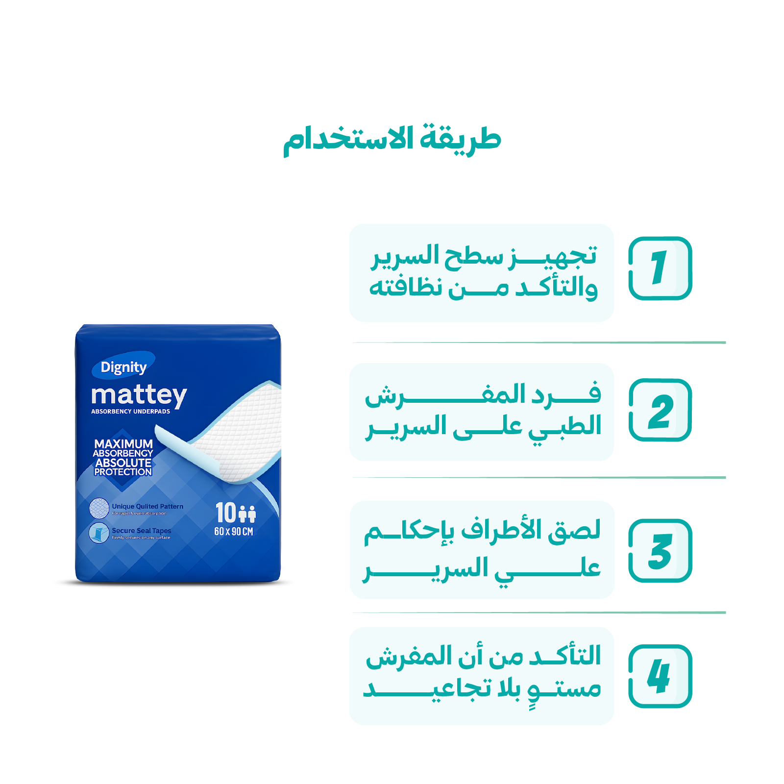 - يُرجى التخلص من المفرش بعد الاستخدام وعدم إعادة استخدامه للحفاظ على النظافة والصحة.