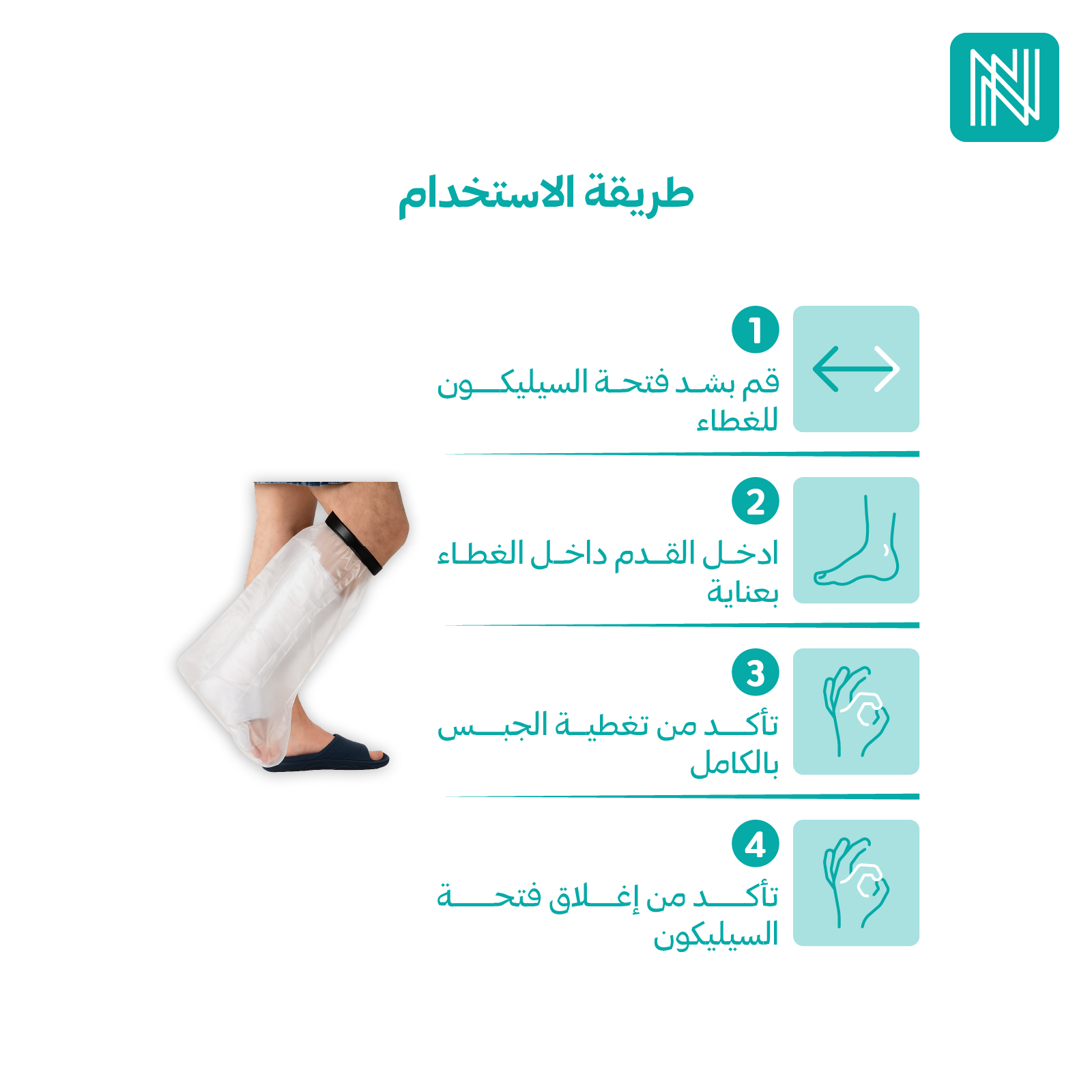 - يُستخدم جراب الجبس الواقي للماء لحماية الجبس أو الضمادات على القدمين من التعرض للماء أثناء الاستحمام أو المطر.