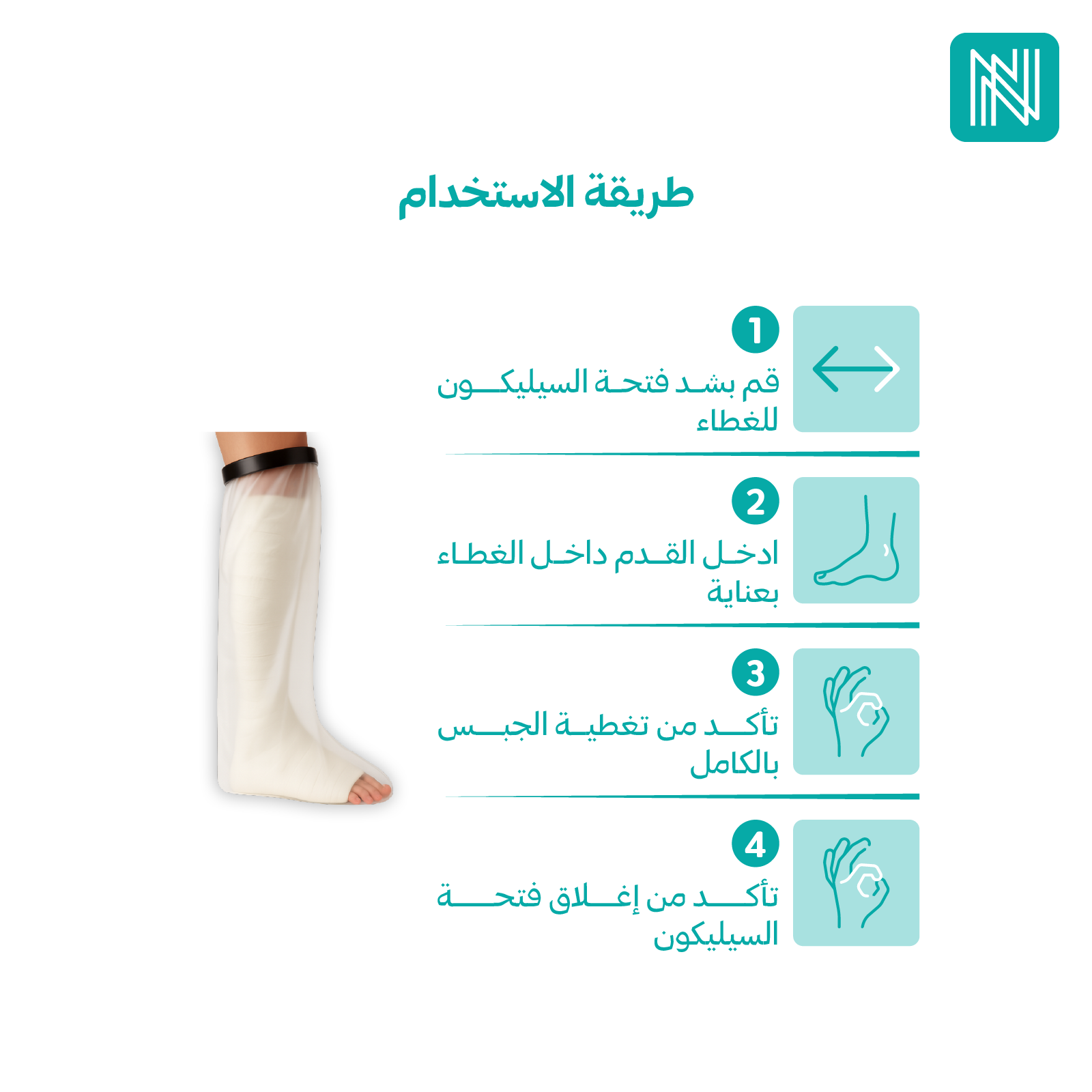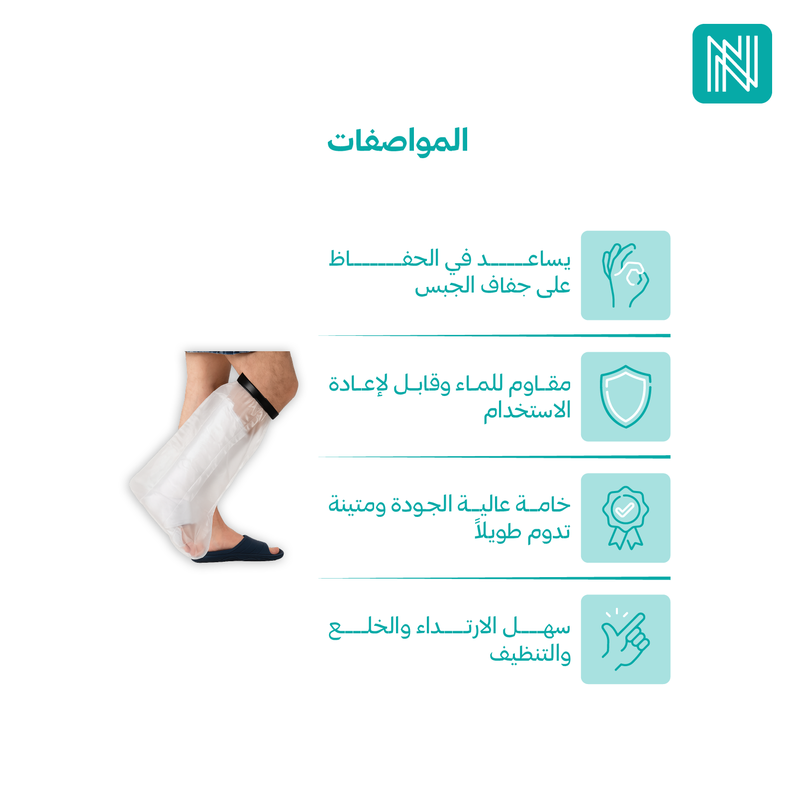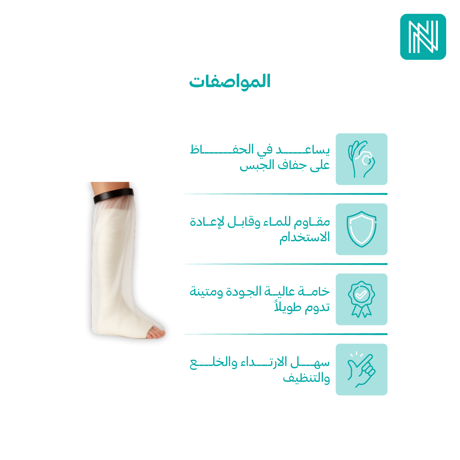 - يُستخدم جراب الجبس الواقي للماء لحماية الجبس أو الضمادات على القدمين من التعرض للماء أثناء الاستحمام أو المطر